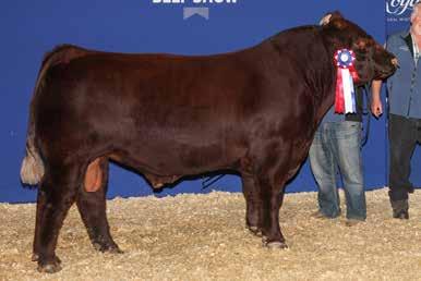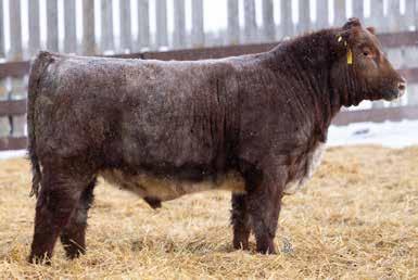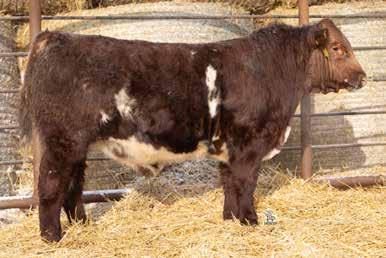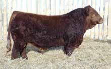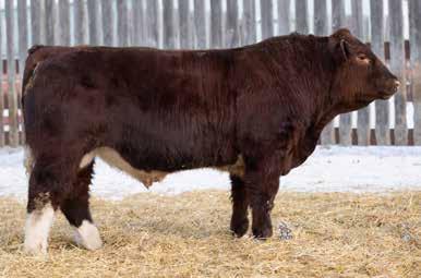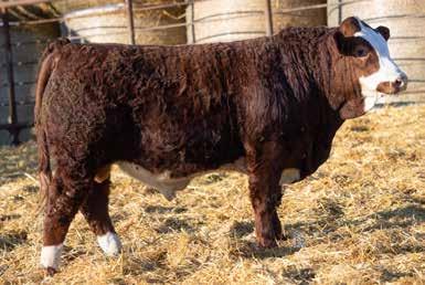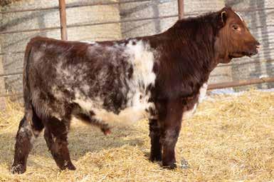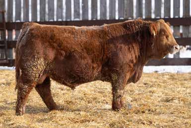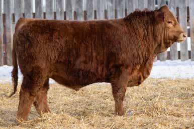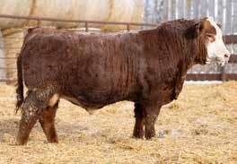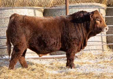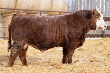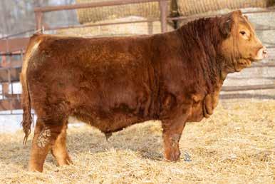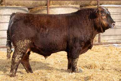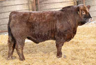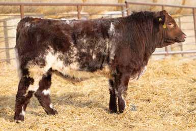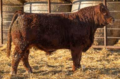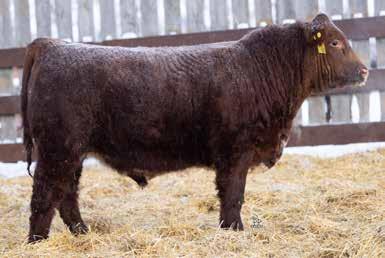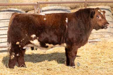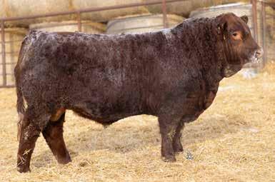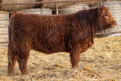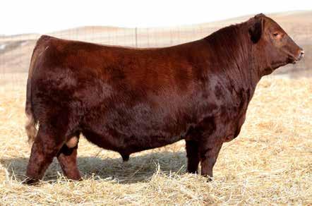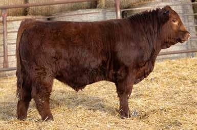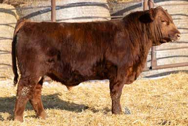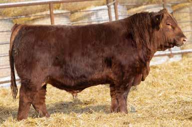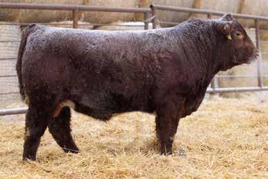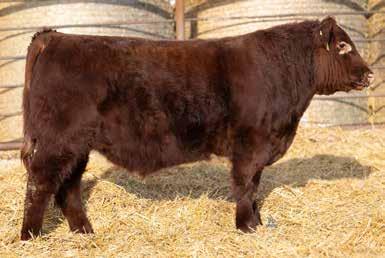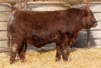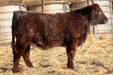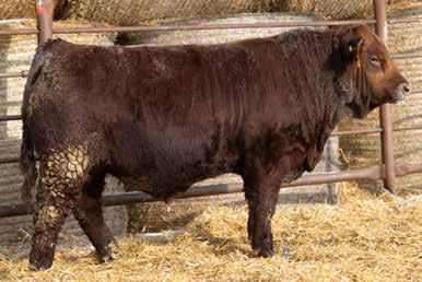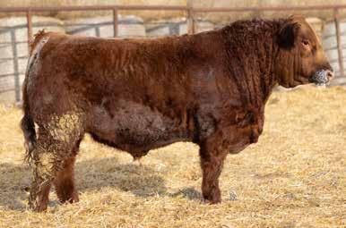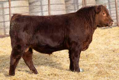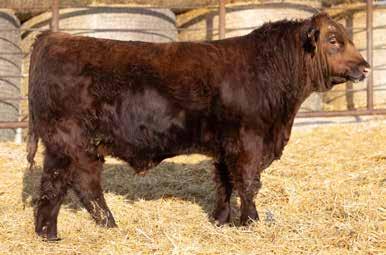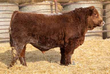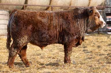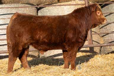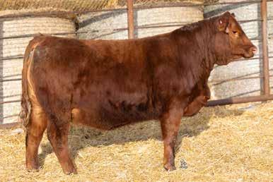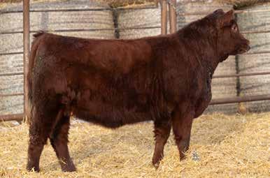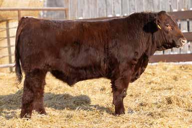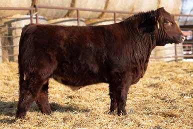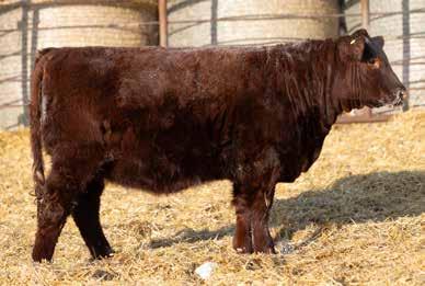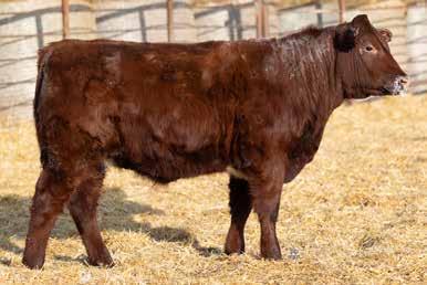 A thick, polled bull that has shown length and eye appeal since birth. Dark red with goggles, he is correct in his movement and sound structured. His dam is liver red with lots of hair and goggles, long-bodied and neatly uddered, with plenty of milk. This bull should sire heavy steers and high-