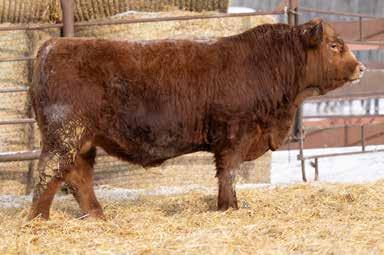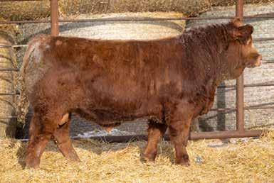 A solid red bull with goggles that is thick and smooth from end to end. He moves freely on sound feet and legs and has solid scrotal development. He carries a quiet disposition, much like his dam, who is a moderate-framed, excellent-uddered female with loads of milk. Her bull from last year is working at Rooke Farms. He should sire heavy steers and attractive replacement heifers — be sure to check him out.