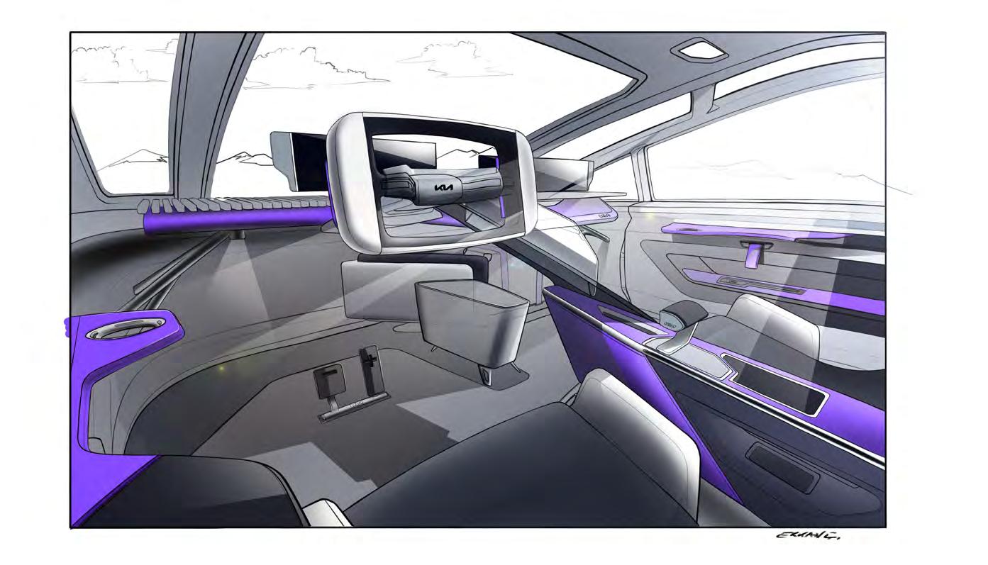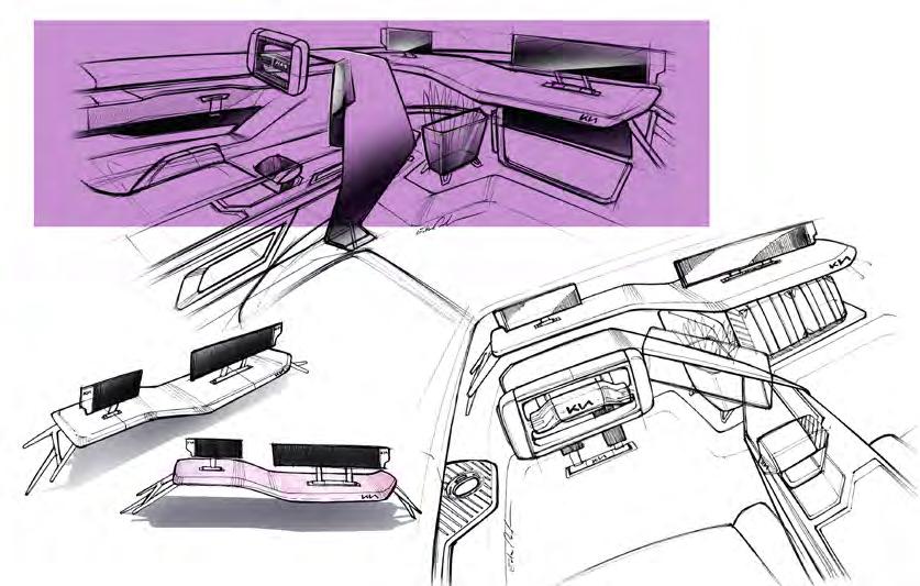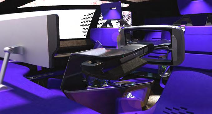 The central screen is the main structure of the dashboard. The infotainment for the passenger and the steering wheel are radially fixed to this central console and can therefore be rotated! This makes it possible to change the driver and passenger position with one rotational movement!