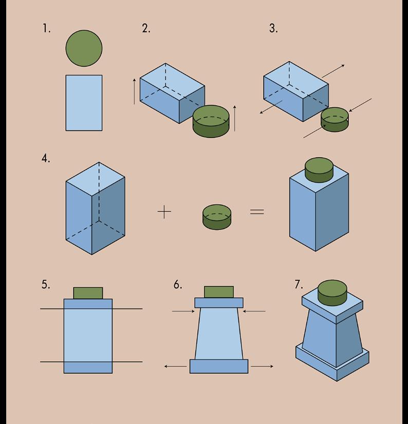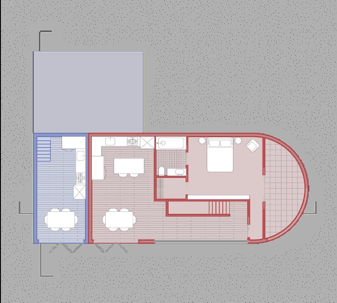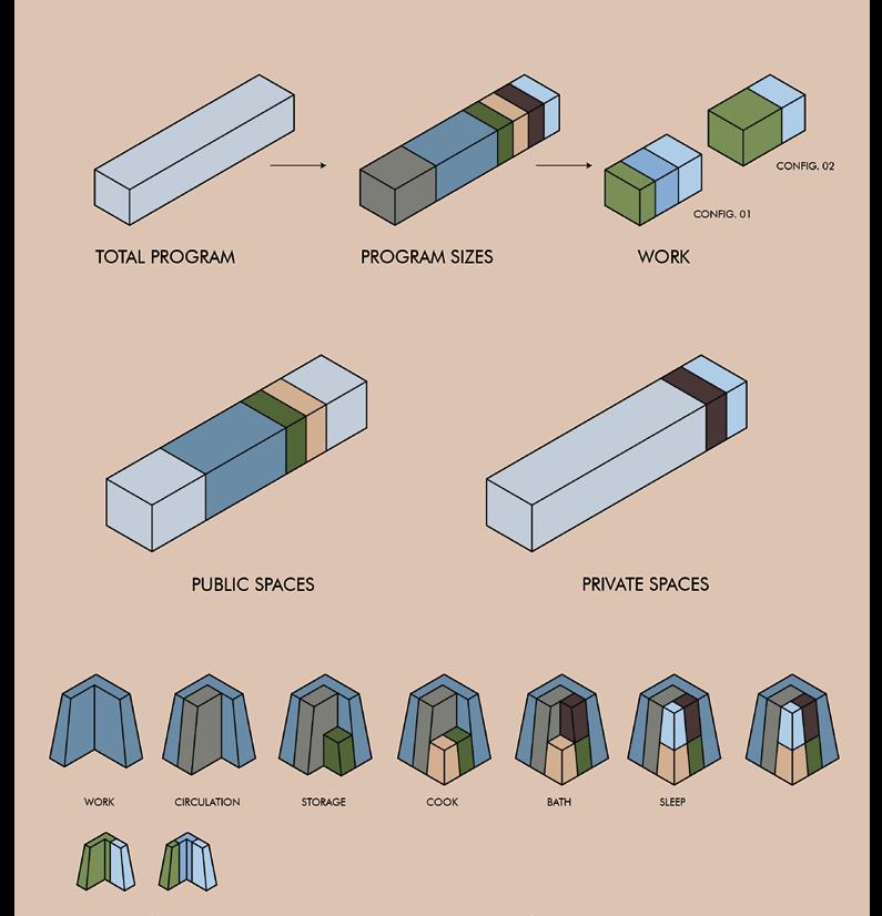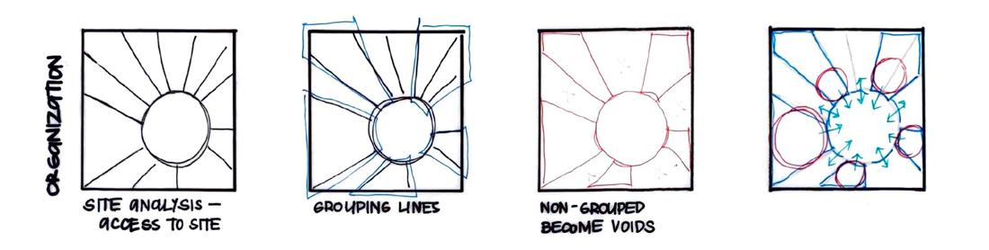 The concept of the structure took inspiration from the gesture site analyses, specifically the access analysis. I focused on this piece which had a similar shape repeated throughout the analysis. With these pieces as a starting point, I extruded and subtracted the shape creating the two variations – one for the personal pods and one for the shared pod. I chose to keep the ends open to allow the extension of the outdoors, indoors.