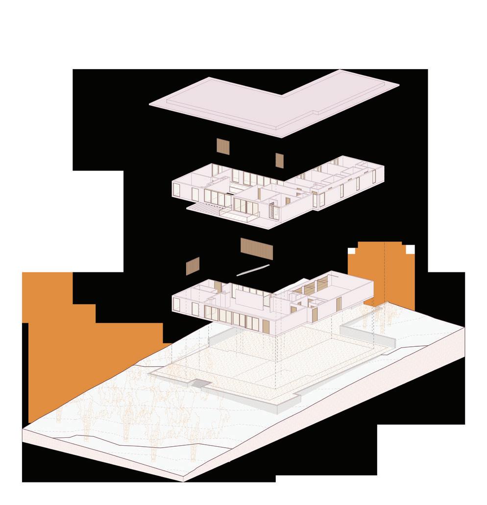 The Pill House is a contemporary, concrete duplex built for the designer-programmer couple, Jade & Priank, and awardwinning TV show writer, Ava. Located on a narrow site in the Bay Area of California, the homes’ designs focus on the opposing aesthetics of each client – futuristic minimalist and vintage maximalist. To meet the opposing needs, the pill shape of a time capsule was used to develop the massing of the homes. Adapting to the steep-sloped terrain, pieces of the home are staggered downward to maximize the plot and square footage of the homes. The interior of the homes creates an inhaleexhale feel as you move through them imitating the feeling of being embraced as you come home and then released of the worries of the day. This is done by creating narrow paths for