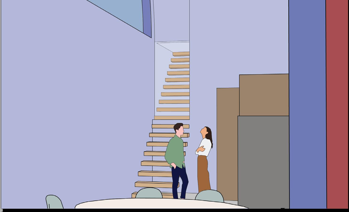 circulation and high ceilings for each room. The apertures used on the facades reflect the shapes of the homes, matching the heights of the ceilings, blurring the lines between the inside and the outside world. Once entering each unit, you are greeted by a living room with double-height ceilings and a view of a lofted workspace that can be converted into a guest room. On this floor, each unit has a staircase that tapers down to a ground floor where the second gathering areas sit. On the ground floor, each unit has a kitchen and dining room that opens into the backyard to extend the gathering spaces, facilitating cherished memories with loved ones. Though each structure has similar programming, the organization responds to the shape of each unit and the needs of each client.