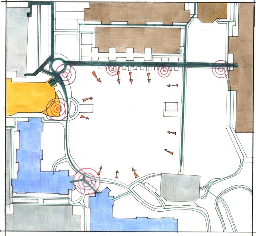 With the site analysis, views, noise, access points, privacy, and visibility were taken into account in choosing the specific point on the Green. From the analysis a spot was chosen on