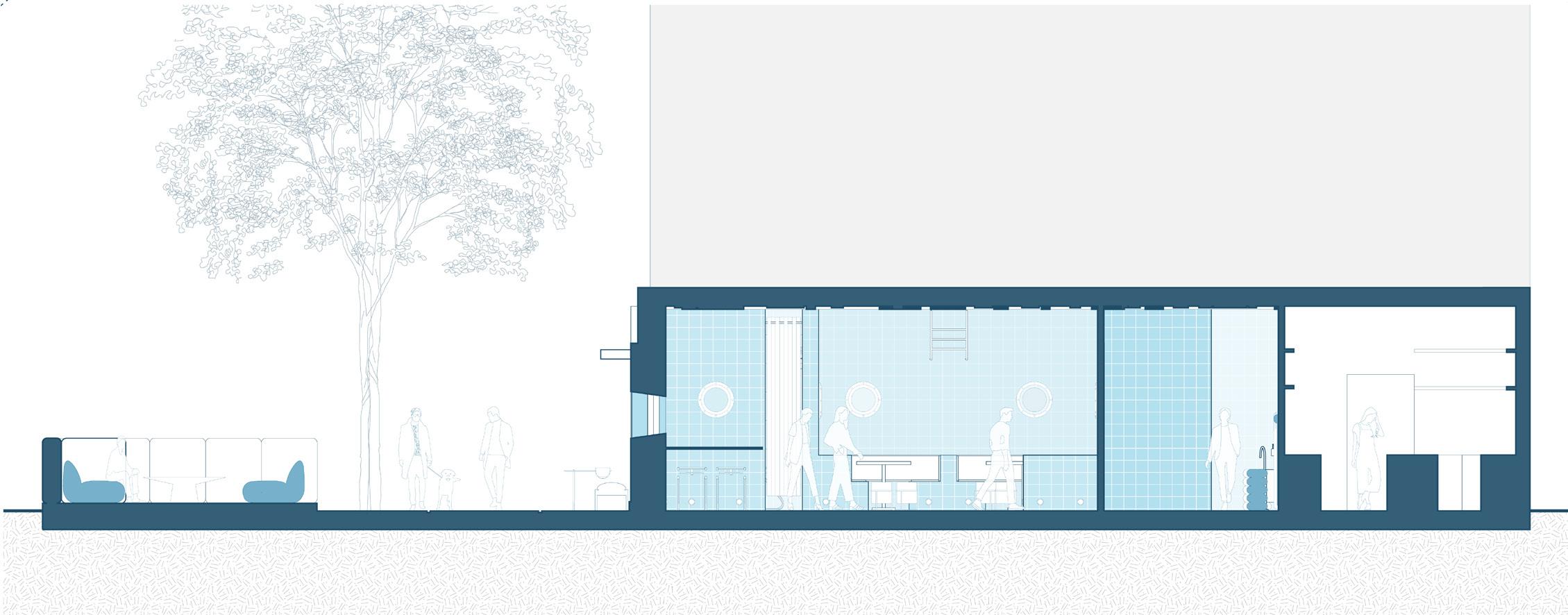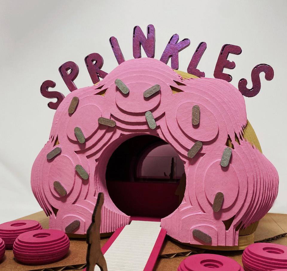 accordion-fan door pushes out the ‘Sprinkles’ sign when open, and pulls the sign in when closed. In the back, take out the window, the window fans open, with the same accordion-fan mechanism as in the front, and closes into the counters. You are guided into the tunnel by a conveyor belt-patterned ramp into a pink interior - reminiscent of a jelly donut. Inside the tunnel, there are iPads on the walls for contactless ordering and paying, and a conveyor belt pickup station. The installation is complete with a takeout window in the back to allow for mobile ordering and pickup, and donut ottomans in the front to encourage interaction between passersby.