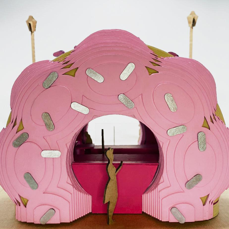 Sprinkles’ donut tunnel is a 120 sqft donut-shaped food kiosk on the Green of Kennesaw State university’s Marietta Campus. The installation is placed on the Off the Grid Strip Food Festival, hosted to offer “additional interaction and meeting places.” It includes a three-donut tunnel and donut-shaped ottomans around the tunnel for additional seating. The shape of the kiosk is a play on scale, as humans enter through the hole of a large donut, where inside, patrons can order an array of mini donuts. The large size of the donuts also contributes to the wow factor - the facades are met with a pink, neon-sprinkled donut, and a large “Sprinkles” hot-sign that retracts into the kiosk itself. The dynamic entrance openings transform the aesthetic, as the