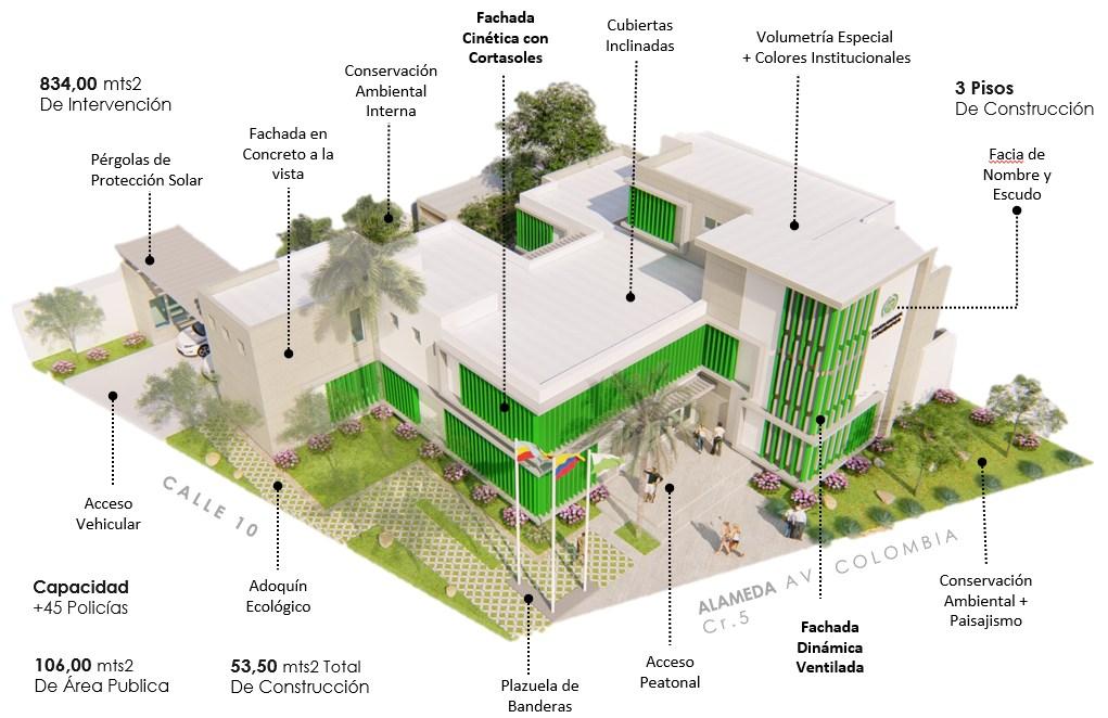 El proyecto contempla una construcción totalmente nueva donde se implantación permite conexión con la alameda de La av. Colombia, y el patrimonio municipal de la Casa de Gobierno así mismo con conservación de especies arbóreas y articulación de la edificación al espacio publico, por medio de la plazoleta de banderas, así como el 1er piso totalmente de servicios con zona de auditorio, comedor, oficinas y CCTV, un segundo piso privado con capacidad para 45 policías, con habitaciones para féminas, profesionales y auxiliares y un 3er piso de casa fiscal.