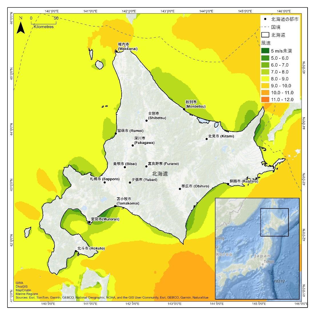 地理的にも日本海、太平洋及びオホーツク海に面している北海道は、日本で 最も有望な着床式および浮体式洋上風力発電の開発ポテンシャルを有してい る。一般海域内での洋上風力発電プロジェクトが進行中の北海道南西部沖 は、年間平均風速が 7m/s を超える比較的安定かつ強風域として知られてい る。
