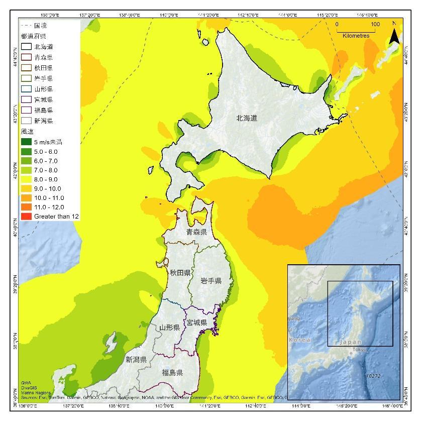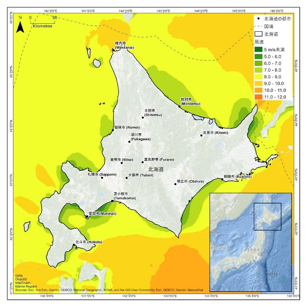 図 2 北海道の洋上風速マップ(150m 地点)
