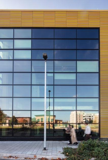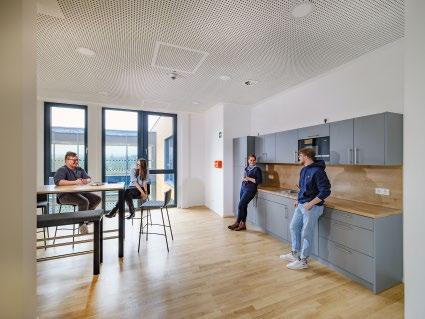 Und dann ist da noch ein dritter Aspekt, der für mich zu einem zeitgemäßen HochschulGebäude dazugehört: Offenheit nicht nur für neue Arten des Lernens und Lehrens, sondern auch für die Gesellschaft, die Umgebung. So wirken wir der Einkapselung entgegen. Wir öffnen Gebäude in ihr städtisches Umfeld, laden ganz physisch zu Einblicken und Besuchen ein. Damit sind explizit auch Unternehmen aus der Region gemeint, die Kooperationen eingehen oder Kapazitäten nutzen können – und so dabei helfen, dass sich Theorie und Praxis lebensnah verbinden. Hier geht es um Austausch. Der hält die Dinge in Bewegung.