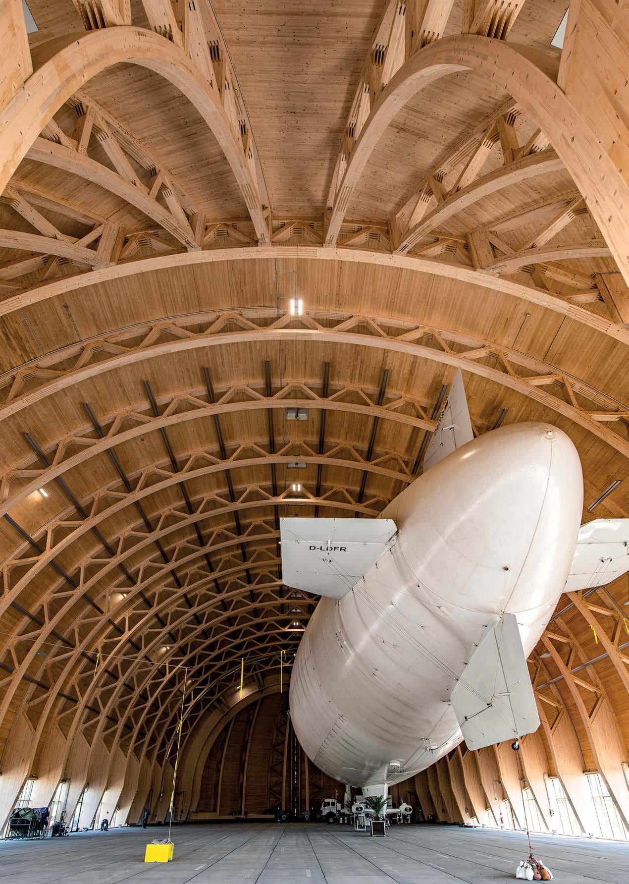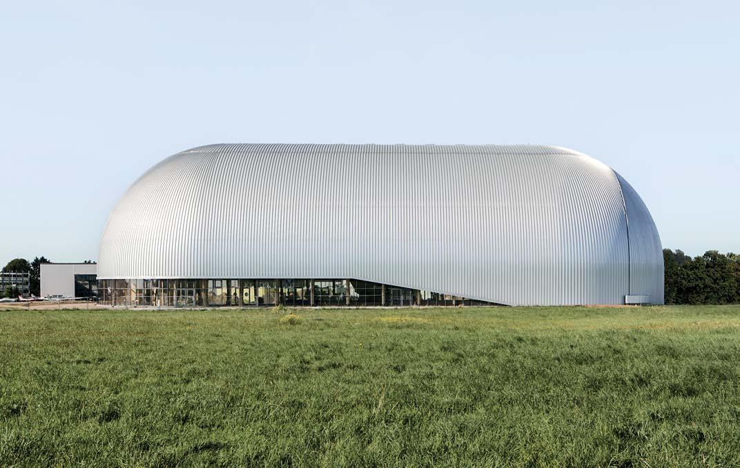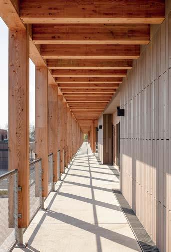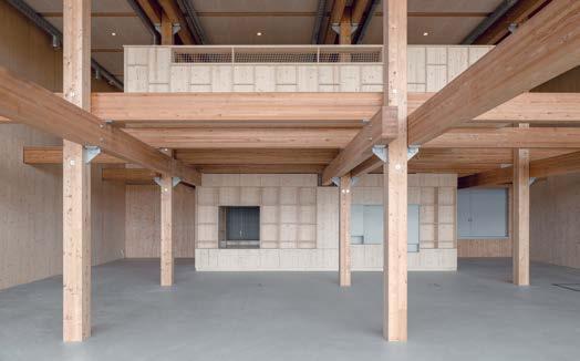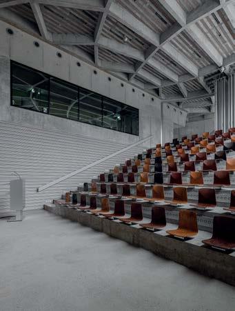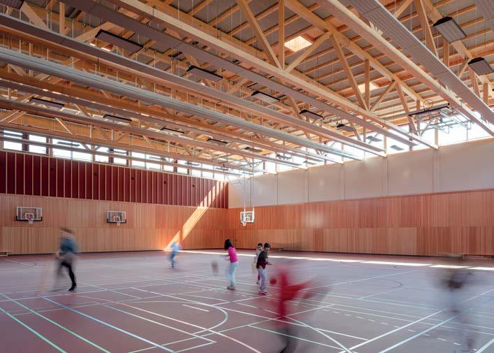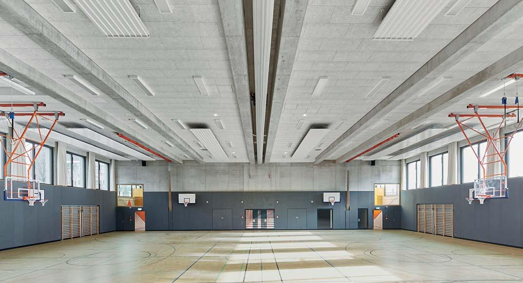 schutz, Brandschutz sowie Standsicherheit. Die Kombination aus Holzbauelementen und Ortbeton ermöglichte schnelle Bauzeiten und Toleranzausgleich. Zwei großzügige, unterteilbare Sporthallen mit umlaufendem Lichtband prägen das Innere. Die 38 m Spannweiten erfordern Festigkeiten, die nur mit Laubholz erreicht werden.