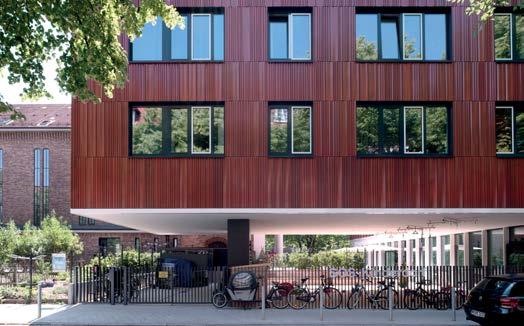 Die vier Klassenhäuser mit je 33 m x 39 m Grundfläche erheben sich aus einem massiven Stahlbeton-Sockelgeschoss. Die Haupttragkonstruktion besteht aus Brettschichtholz(BSH)-Stützen und Trägern im Holzskelettbau. Holz-Beton-Verbunddecken überbrücken 8,10 m Spannweiten und erfüllen Anforderungen an Schall- und Wärme -