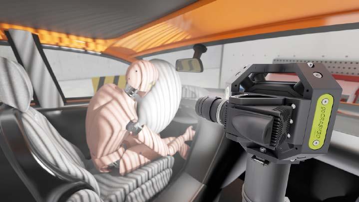Bewegungen oder Verformungen im FahrzeugInnenraum dreidimensional messen kann. Damit war die Idee zu Gocrash3D geboren – einem ultrarobusten 3D-Messsystem, das auch bei Beschleunigungen und Schocks von bis 60 g noch präzise messen kann. Mit einer Hochgeschwindigkeitsprojektion im Millisekunden-Bereich erzeugt Gocrash3D bis zu 1.200 3D-Bilder pro Sekunde mit jeweils bis zu 250.000 3D-Punkten. Mit einem Messfeld von bis zu 0,7 × 0,7 m² ermöglicht es diese Technologie, Bereiche im Fahrzeuginnenraum zu erfassen, deren Bewegung oder Deformation bisher nicht ohne speziell aufgebrachte Marker gemessen oder überwacht werden konnte, zum Beispiel im Fußraum. Gocrash3D wurde erstmals im Jahr 2023 im Rahmen von Sicherheitsversuchen bei Volkswagen eingesetzt. Dadurch dass das System so optimiert ist, dass sich das Messsystem unkompliziert und ohne großen Aufwand vorbereiten und einrichten lässt, verzögert es die Abfolge der Versuche an den Schlittenanlagen nicht. Damit