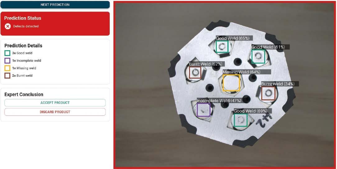 von wenigen hundert Millisekunden eine Auswertung über die Schweißnähte bereitstellen. Das Modell trifft dabei jedoch keine autonome Entscheidung über die Defekte, sondern unterstützt Anwender bei der Einschätzung. Anwender können anschließend auswählen, ob das Modell richtig liegt oder ob ein Fehler vorliegt. Anschließend wird das Bild zusammen mit der Einschätzung des Experten gespeichert und steht als Datengrundlage für ein zukünftiges Nachtrainieren des Modells zur Verfügung. Somit wird das Modell im Laufe der Zeit verbessert und die Fehlerquote sinkt durch eine wachsende Menge an Trainingsdaten. Zukünftig könnte das Modell auch selbstständig Entscheidungen treffen und somit die Effizienz in der Produktion weiter optimieren. a