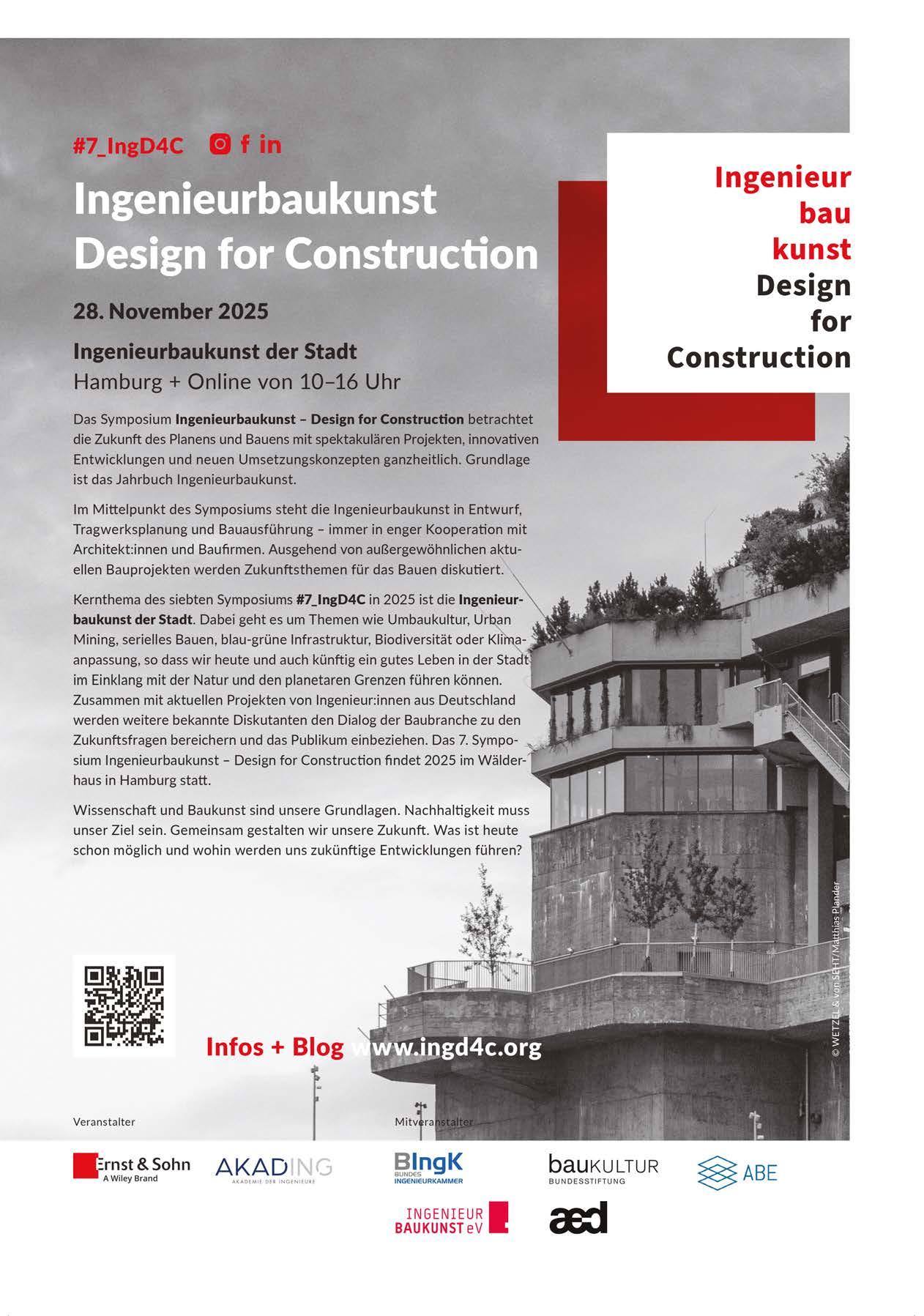 26.-27.11.2025, München BIM World Munich https://www.bim-world.de/ 28.11.2025, Stuttgart Bauphysikertreffen 2025 der HfT Stuttgart https://www.hft-stuttgart.de/bauphysik/ veranstaltung/bauphysikertreffen-2024 28.11.2025, Hamburg 7th Annual Symposium IngD4C – Ingenieurbaukunst der Stadt https://ingd4c.org/