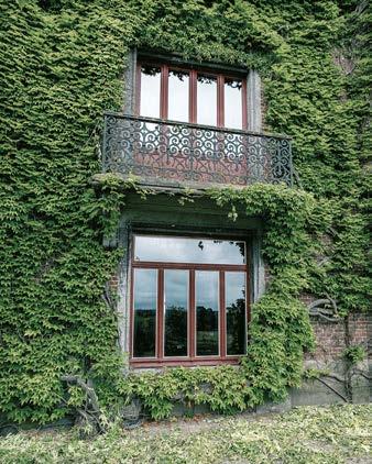 bestehen die Stürze und Leibungen aus Natursteinelementen, die von innen nach außen durchbinden – die Luftschicht ist hier also unterbrochen. Dies gilt ebenso für die Eckpfeiler im Bereich des Erkers. In diesen Zonen wurde auf der Raumseite eine Innendä mmung aus Kalziumsilikatplatten aufgebracht, die thermisch dicht an die Blendrahmen der neuen Holzfenster anschließt. Auch der Anbau aus den 1960er-Jahren wurde von innen gedämmt, da er mit einem einschaligen Mauerwerk ausgeführt wurde.