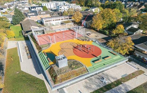 Zum Titelbild: Für die Umgestaltung des zentralen Platzes im Ortskern der Gemeinde Alfter, dem „Herrenwingert“ wurde ein integriertes städtebauliches Entwicklungskonzept aufgestellt. Das von Königs Architekten PartGmbB gemeinsam mit STERN LANDSCHAFTEN BDLA vorgelegte Gestaltungskonzept konnte die Jury des Architekturwettbewerbs und den Gemeinderat überzeugen. Ein erstes umfangreiches Projekt war der Neubau einer Kultur- und Sporthalle als Ersatz für die baufällige und nicht wirtschaftlich zu sanierende Mehrzweckhalle in direkter Nachbarschaft zum Neubau. Der Bolzplatz, der dem Neubau weichen musste, findet zwei Etagen höher auf dem Flachdach der neuen Kulturund Sporthalle einen modernen Ersatz. Hier sind außerdem Fitness- und Erholungsbereiche und ein Ballsportfeld vorgesehen. Der multifunktional nutzbare Hallenbau ist mit dem ökologischen EVALASTIC-Flachdachsystem (Fa. Alwitra) abgedichtet, siehe auch Beitrag ab S. 357 f. (Foto: alwitra/Sven-Erik Tornow)
