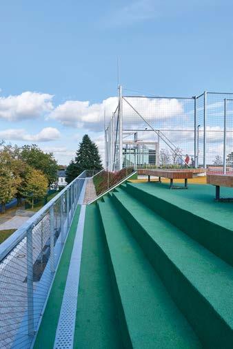 rand hin abgesenkt. Da auch dieser auskragende Bereich teilweise nutzbar ist, wurden in die steilen Dachbereiche sowohl Treppenstufen als auch tribünenartige Abtreppungen integriert (Bild 3). Zudem mussten neben den in der Fläche angeordneten Entwässerungsund Notentwässerungspunkten auch in den insgesamt 50 0 m² großen tieferliegenden Umrandungen entsprechende Gefälle und Gullys eingebaut werden.