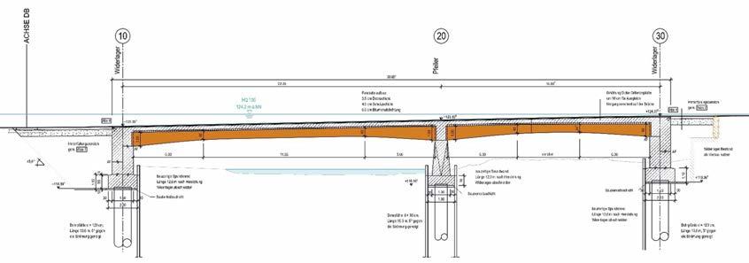 uneingeschränkt befahrbar bleiben musste. Die Brücke kommt hier direkt an einer Straßenkreuzung an, daher war der Überbau bereits im Bestand stark aufgeweitet, um die erforderlichen Schleppkurven einhalten zu können.
