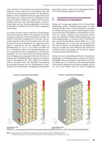 Infolge der Vorspannung ergaben sich im Wesentlichen gleichmäßig verteilte Hauptdruckspannungen in Ringrichtung. Erhöhte Werte zwischen Hüllrohren und äußerer Netzbewehrung sind auf die Schwächung des Betonquerschnitts durch die Hüllrohre zurückzuführen. Im Bereich der äußeren vertikalen und horizontalen Bewehrung sind signifikant erhöhte Hauptzugdehnungen und Hauptzugspannungen zu erkennen, die im Wesentlichen quer zur Schalenmittelfläche wirken (Bilder 10, 11 und 12 = Abbildungen 72, 73 und 75 aus [4]). Besonders deutlich wird der Einfluss der Hüllrohre bei der Ringbewehrung, die auf Höhe der Achse Hüllrohre liegt. Hier treten wesentlich höhere Spannungen auf als bei der Ringbewehrung zwischen den Hüllrohren. Infolge der Sonneneinstrahlung bleiben die Hauptdruckspannungen in Umfangsrichtung im Beton der äußeren Wandhälfte nahezu unverändert, während sie in der inneren Hälfte um ca. 15 % abnehmen. Die Druckspannungen in der äußeren Ringbewehrung nehmen dagegen stark zu (ca. 37 %). Dies bedeutet also eine weitere Umlagerung