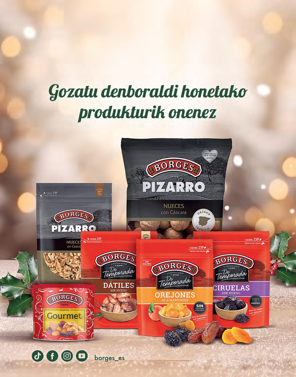 Eguberri hauetan, gure kolorea gorri aukeratzarra da. Izan ere, egunerokoan beti prezio onean dauden ehunka produktuez gain, aukeratzarrak datoz, jai hauetan ezeren faltarik izan ez dezazun. Arrainak, itsaskiak, arkumea, frutak –anana, adibidez, oso ohikoa egunotan–, turroiak... prezio ezin hobeetan.