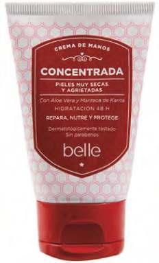 CONCENTRADA belle Crema de acción intensiva, que aporta una protección extra para las pieles muy secas. Con glicerina vegetal al 30% y manteca de karité, para una acción reparadora en profundidad, que reduce y previene el agrietamiento. Contiene también extracto de aloe vera y alantoína, para aliviar la sequedad y tirantez de las manos agrietadas. Su fórmula aporta 48 horas de hidratación a la vez que repara, nutre, alivia y protege. Su envase es perfecto para llevarlo en el bolso o el neceser.