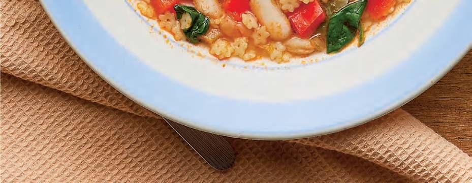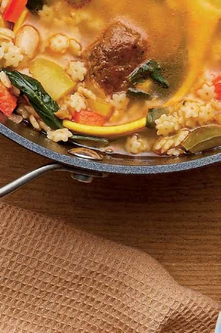 Mientras, marcar las albóndigas en una sartén y, cuando a la pasta le queden tres minutos, añadirlas al puchero junto con las alubias blancas y las espinacas.