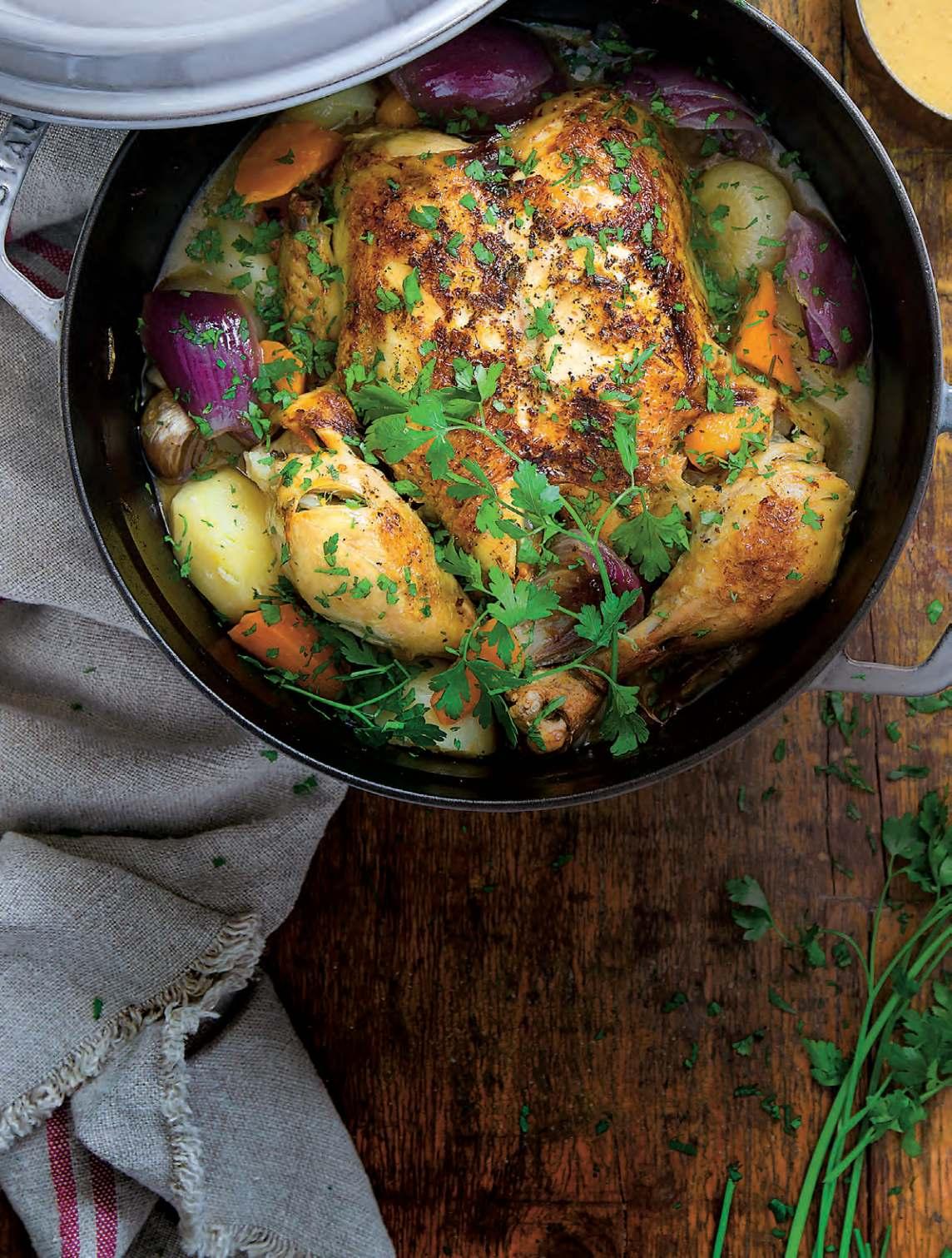 Volver a colocar el pollo en la cazuela, tapar y hornear durante una hora.
