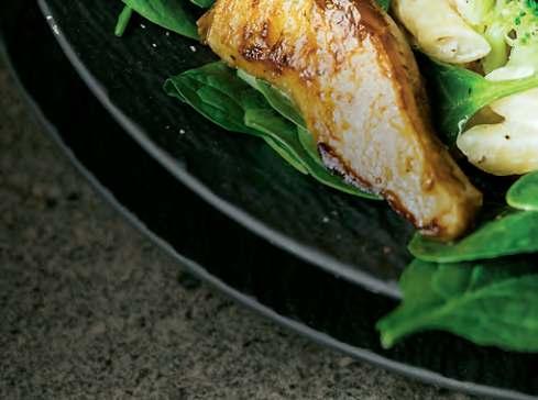 Para montar el plato, preparar una cama de espinacas, aderezarlas con la vinagreta y las nueces picadas. Cubrir con el pollo, las peras salteadas y la pasta con brócoli y pera.