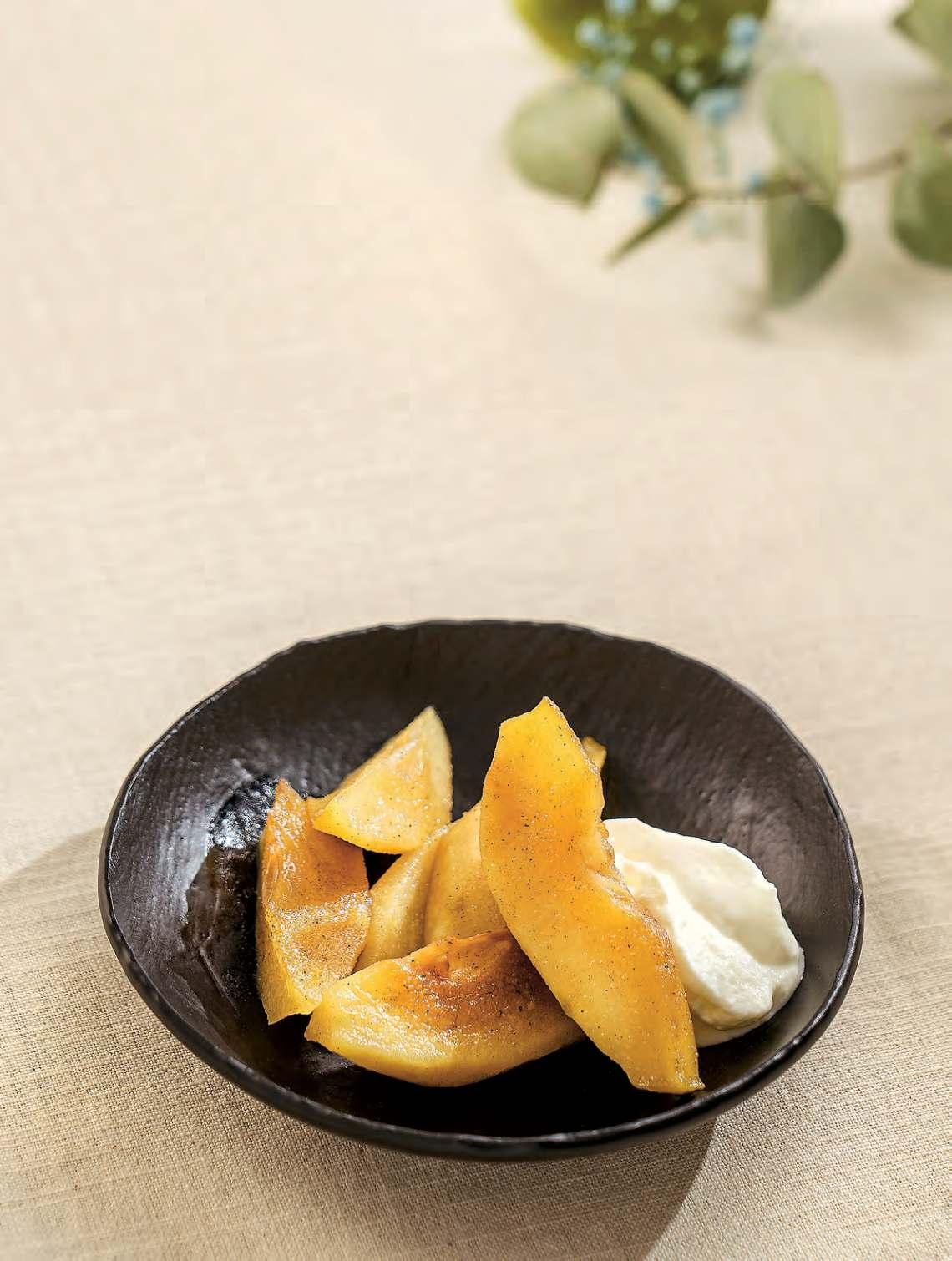 Partir las peras en cuartos, retirando las semillas, y saltear la mitad en una sartén