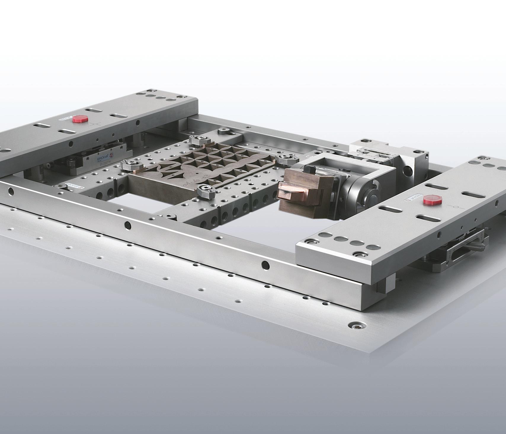 I mandrini di serraggio piatti EROWA sulla tavola macchina costituiscono l‘interfaccia flessibile con i portapezzi. Il sistema di serraggio EROWA Wire EDM è idoneo, in base alle esigenze, alla palettizzazione singola o alla palettizzazione multipla in una cornice di serraggio.