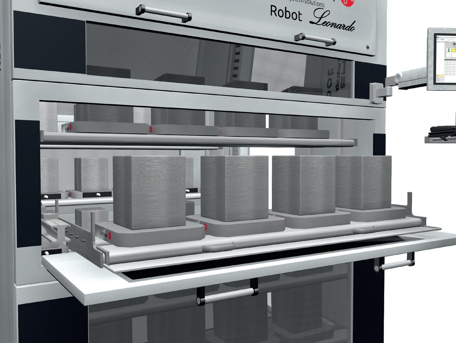 32 pallet UPC (320x320 mm) trovano posto sugli appena 4m2 di superficie di ingombro di Leonardo. Grazie alla stazione di carico integrata si può evitare anche una postazione di attrezzaggio esterna.