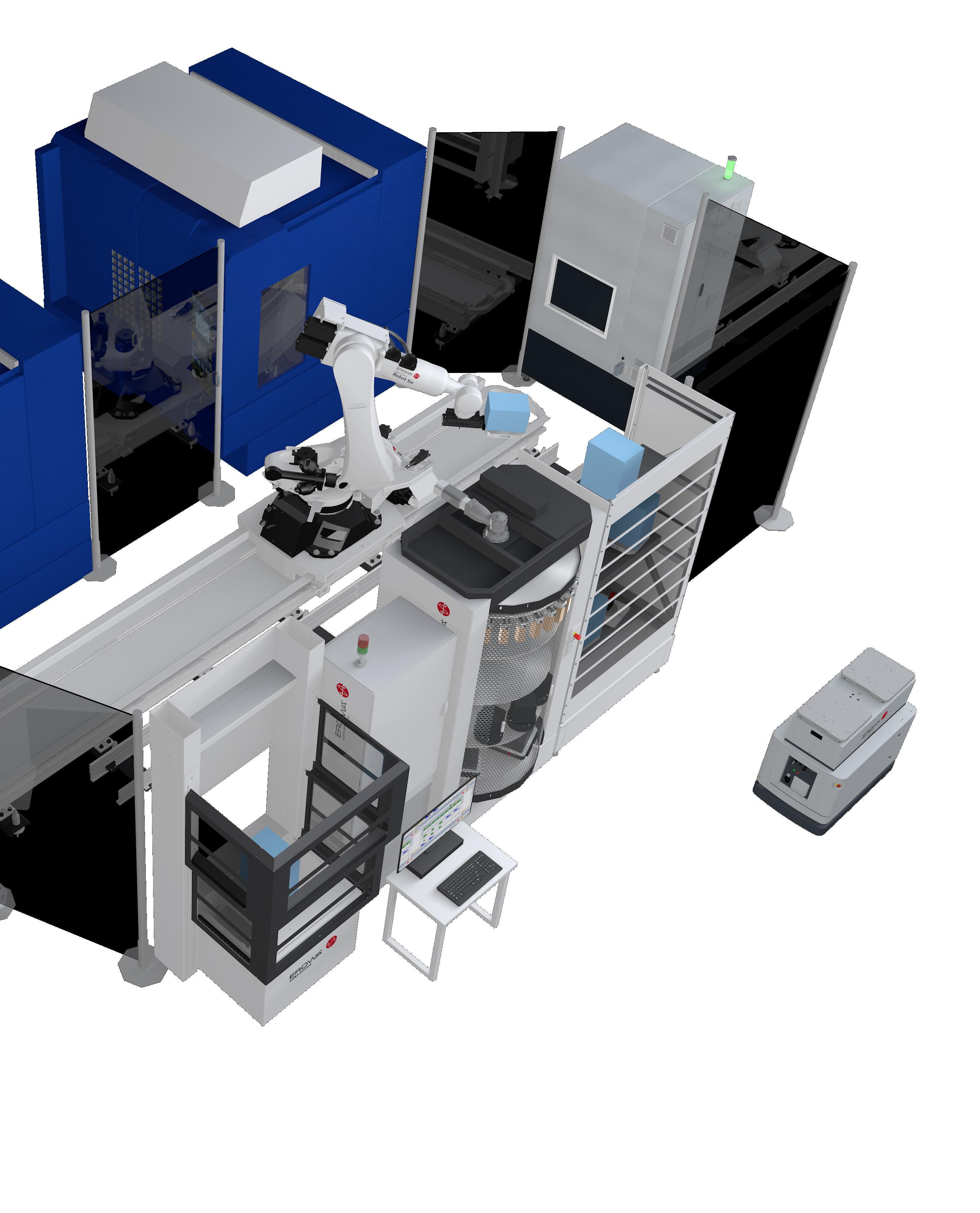Livraison et retrait automatiques d’outils depuis le point de sortie vers la cellule, ou d’ébauches depuis le poste de préparation, ou de pièces usinées vers l’étape de production suivante.