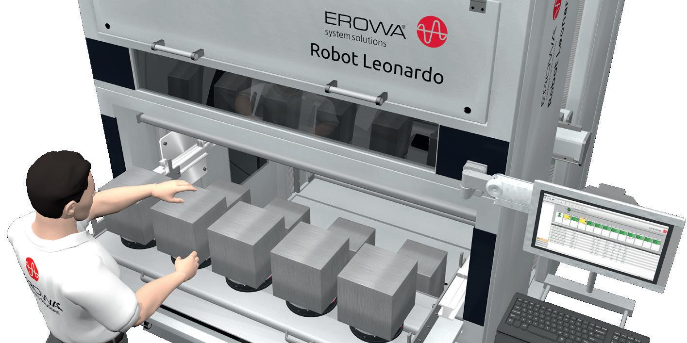 Leonardo ist ein Paletten-Handlinggerät mit MehrebenenMagazinen. Das Transfergewicht ist 120 kg. Die X-Achse weist einen langen Fahrweg von 1565 mm auf und reicht damit auch in grosse Maschinen.