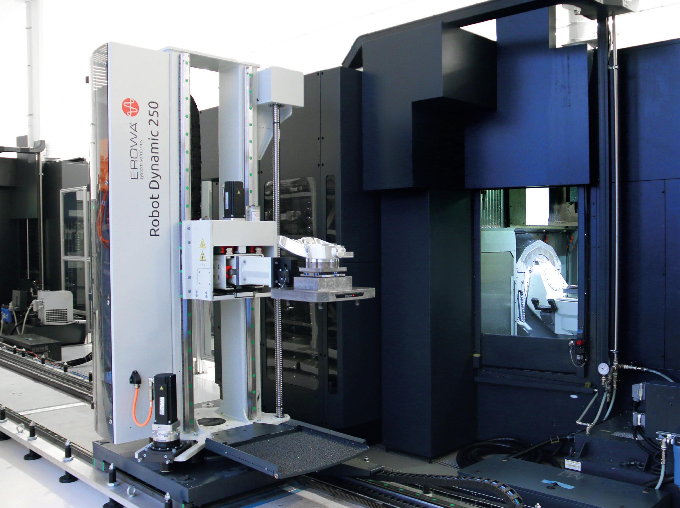 Herzstück ist der EROWA Robot Dynamic 250 Linear, der zwei 5-Achs-Bearbeitungszentren von MAKINO im Verbund bedient. Die vier Rackmagazine und die zentrale Beladestation ermöglichen einen vollautomatischen 24/7-Betrieb – flexibel für Einzelteile ebenso wie für Kleinserien. Dank des MTS und PC210 Combi Nullpunktspannsystems mit Palettengrössen MTS 400, PC 210 und ITS 148 mm gelingt der Werkstückwechsel flexibel, schnell und sicher – reproduzierbar auf unter 3 Mikrometer.
