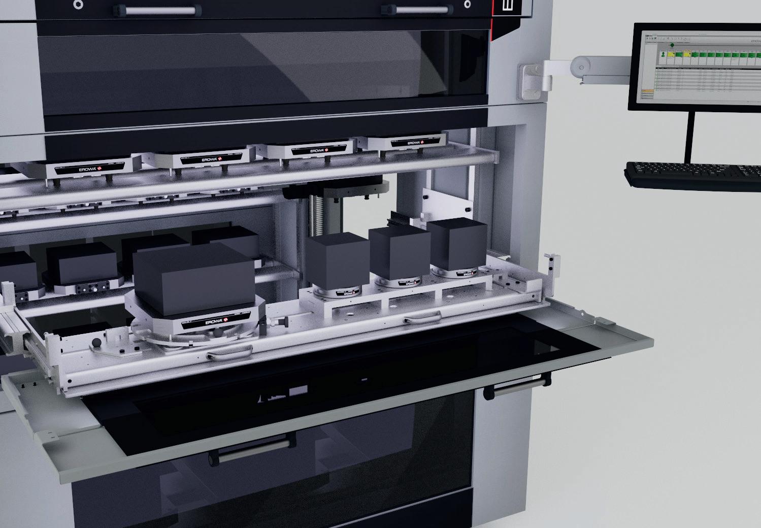 64 UPC Paletten (320x320mm) finden Platz auf den knapp 4m2 Stellfläche des Leonardo. Dank der integrierten Beladestation erübrigt sich auch ein externer Rüstplatz. Die verschiedenen EROWA-Standardpalettengrössen werden optimal auf den Speicherebenen abgelegt. Je nach Bedarf können die Ebenen in der Höhe angepasst werden, um eine effiziente Nutzung des verfügbaren Platzes zu gewährleisten.