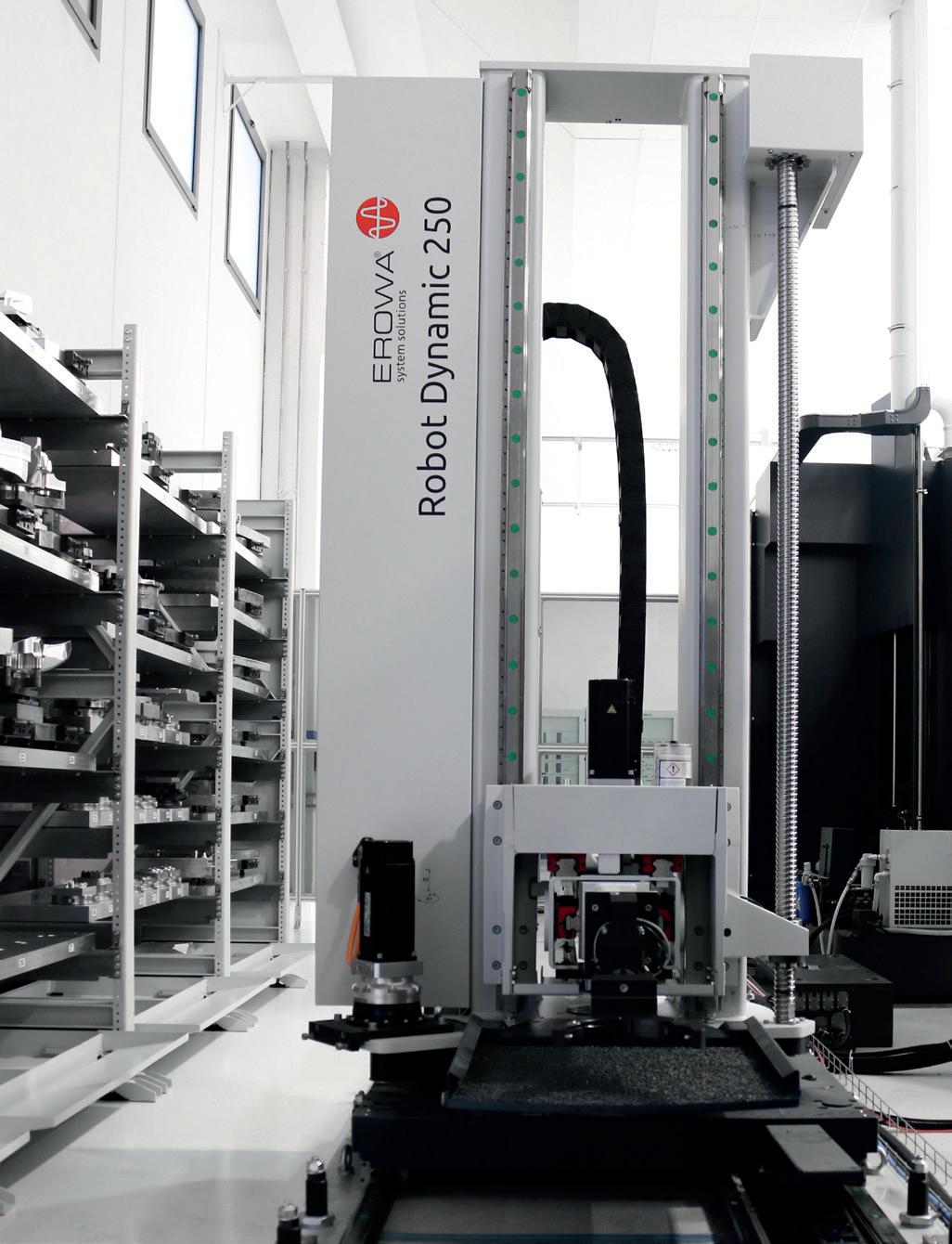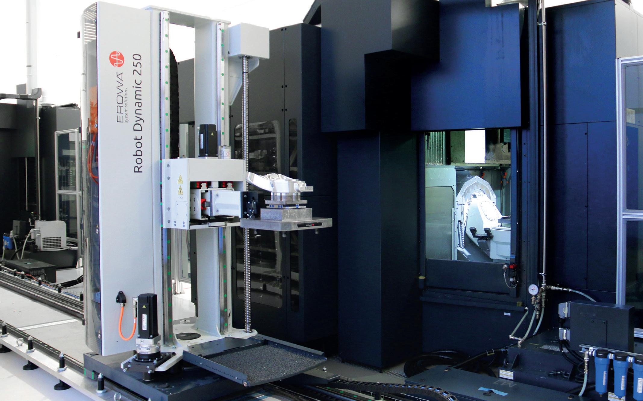 Il cuore del sistema è l‘EROWA Robot Dynamic 250 Linear, che gestisce due centri di lavorazione a 5 assi di MAKINO in linea. I quattro magazzini a rack e la stazione di carico centrale consentono un funzionamento completamente automatico 24 ore su 24, 7 giorni su 7, con la massima flessibilità sia per i singoli pezzi che per le piccole serie. Grazie al sistema di serraggio a punto zero MTS e PC210 Combi con pallet di dimensioni MTS 400, PC 210 e ITS 148 mm, il cambio dei pezzi è dinamico, rapido e sicuro, con una ripetibilità inferiore a 3 micrometri.