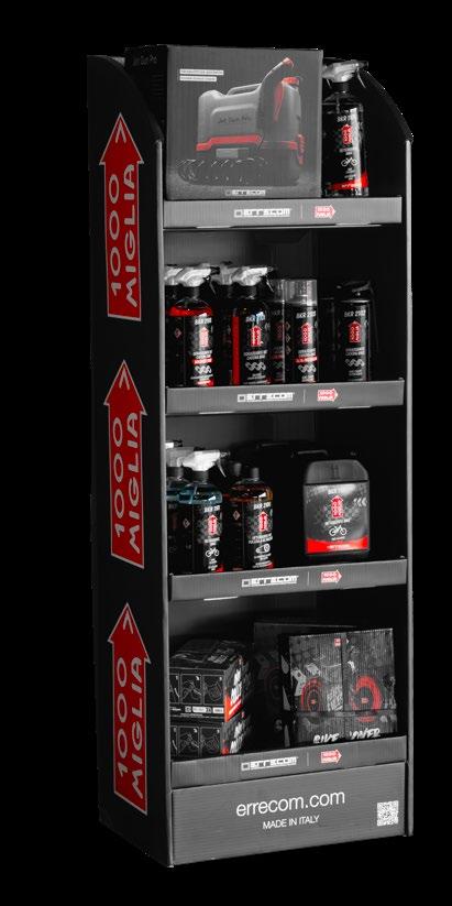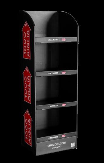 Lo sfondo nero, arricchito dall’iconica freccia rossa 1000 Miglia , crea un contrasto visivo che valorizza i prodotti, trasmettendo l’adrenalina e la performance tipiche dello sport. Il design minimalista e moderno si unisce alla funzionalità di un espositore leggero, resistente e facilmente montabile , ideale per ogni punto vendita che necessita di un allestimento pratico e di grande impatto.