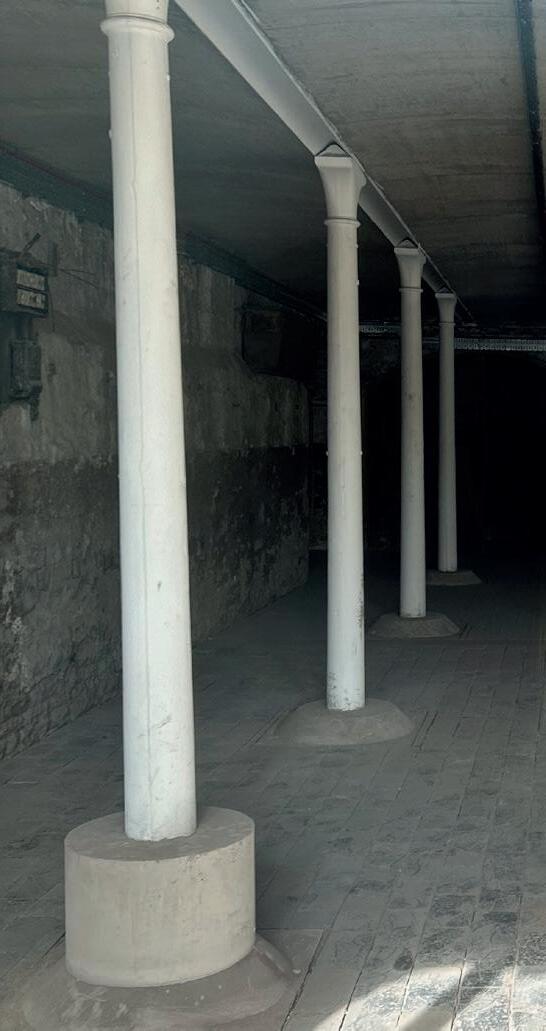 The grade II listed wall sits at the south boundary of our site. We have opted to retain the majority of it due to its historical importance, therefore only opening up a 14m bay to facilitate the new public axis. We were cautious to cut away only as many window apertures as was necessary. The 19th-century jack arch structure at the south of the site at street level contains iron columns (shown below). Since we are not using these structurally and they are tightly spaced, we have opted to dismantle most, retaining some as a subtle nod to heritage. The dismantled columns are recycled.