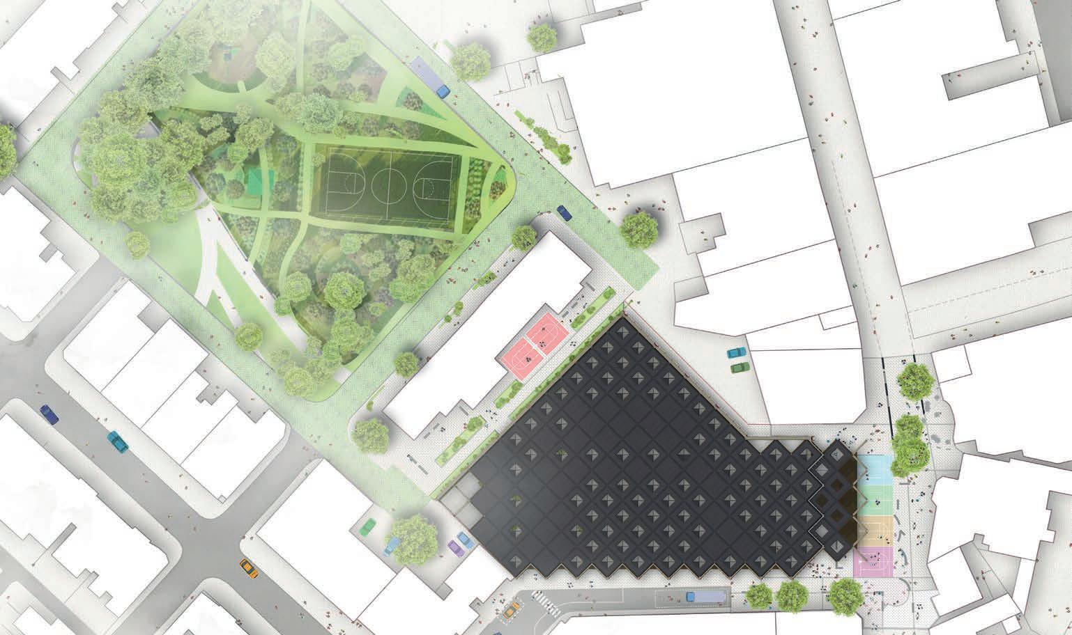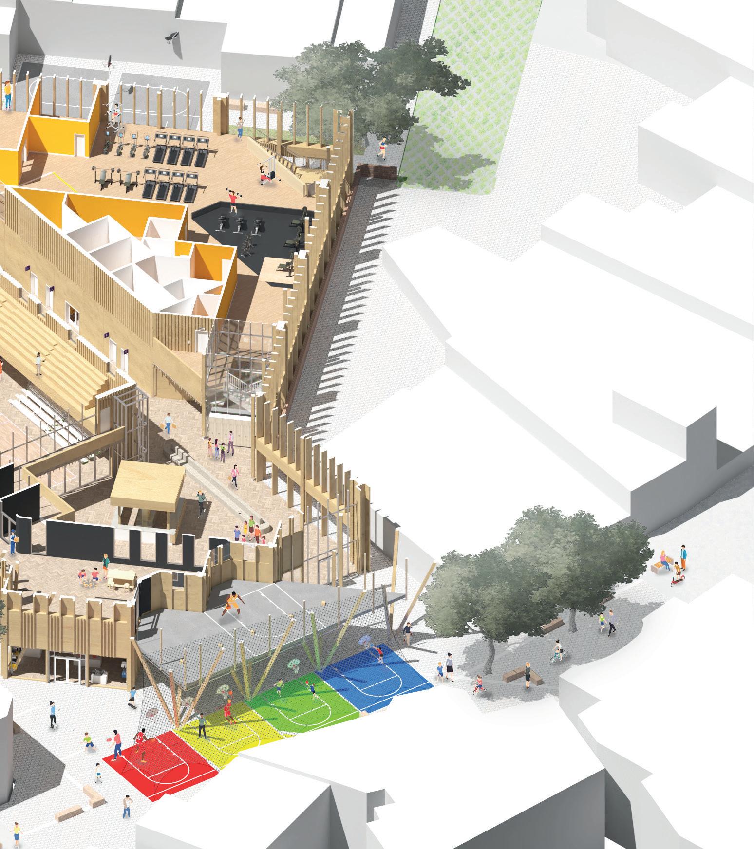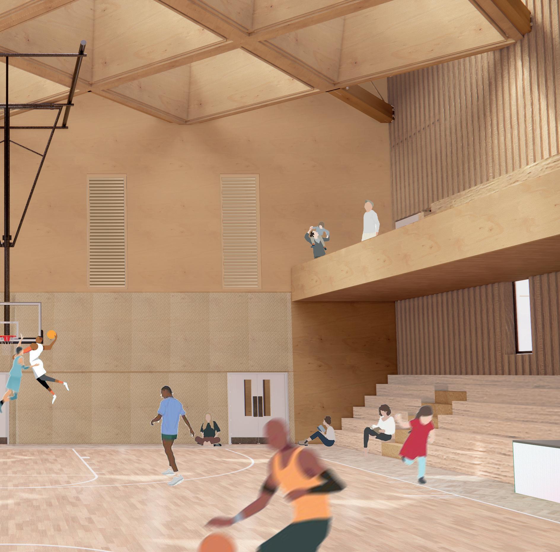 As the building’s architectural language extends toward the adjacent high street, it becomes impossible for passersby to overlook. The vibrant, colorful half-courts, framed by benches and protective netting, draw attention, while the expressive timber frame showcases the impressive span of the interior spaces. This design ensures that not only the building’s users benefit from its elegant architecture, but also high street shoppers, who can appreciate the dynamic structure without needing to enter the building.