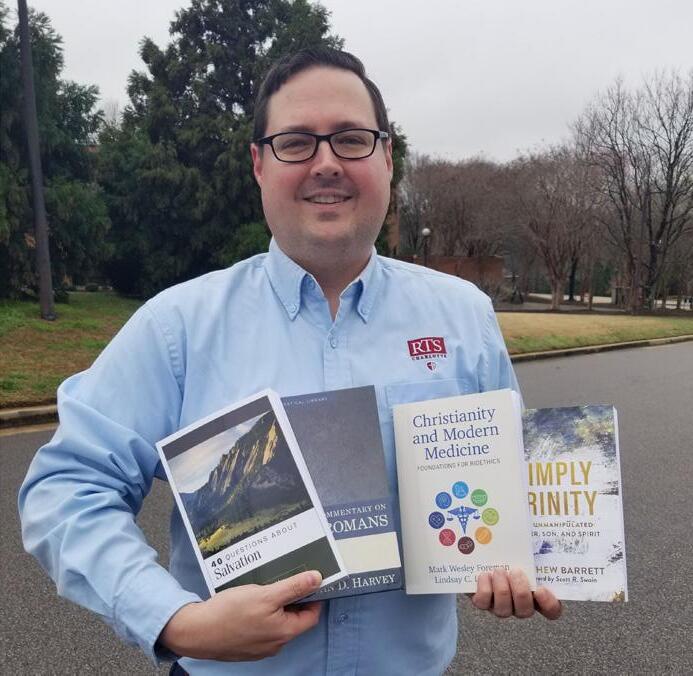 Rev. G. Mark James is currently pursuing a Master of Theology (ThM) degree at Erskine Seminary. He serves as an Instructional Designer and Canvas Administrator for RTS – Global, as Stated Clerk of First Presbytery (ARP), and is an ordained minister with six years of pastoral experience. At a recent Southeast Regional Meeting of the Evangelical Theological Society, he was awarded a cash prize and books (see photo) for his student paper submission entitled “The Ethics of Affliction in Psalm 22.” Rev. James and his wife, Jacqueline, live with their four children in Stanfield, NC.