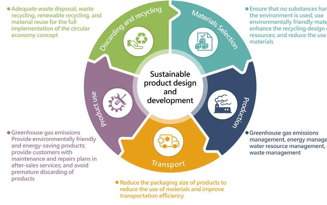Ensure that no substances harmful to the environment is used; use environ mentally friendly materials; enhance the recycling design of resources; and reduce the use of materials.