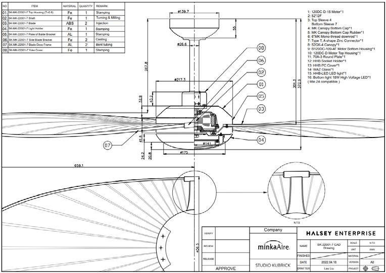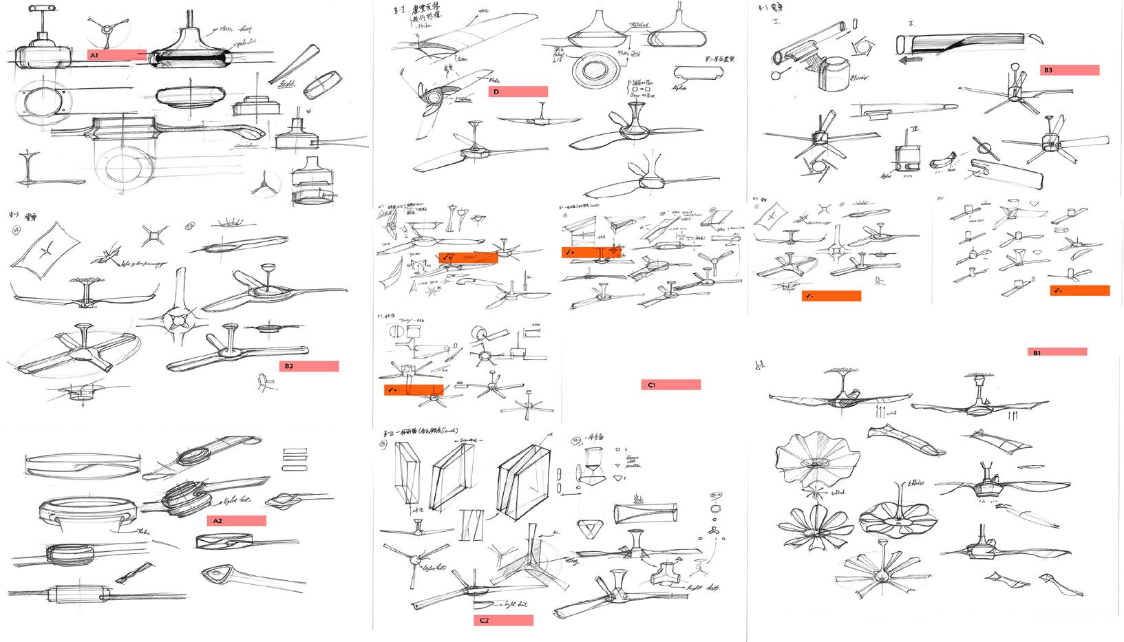We want to retain the overall umbrella shape of the light design and translate them into fan elements. In addition, we work on creating a two-piece blade structure that allows it to follow naturally with the housing body and creates a fluidity aesthetic.