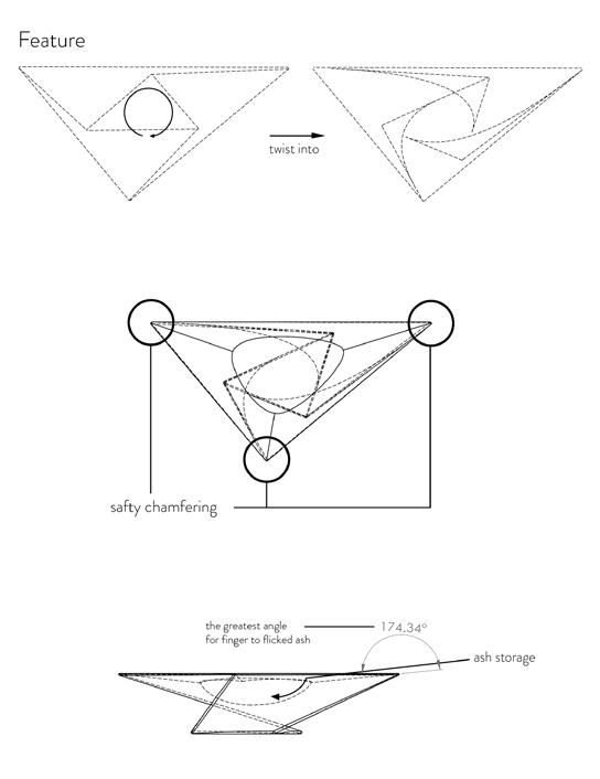 ARCTRI is committed to expressing the sense of geometry and dynamics. It forms a blend of angles, arcs, straights and curves with angle changes. The two triangles are rotated and stretched to twist out the curved surface on the side, and the buildinglike form is displayed on the desktop. On the ashtray, the straight edges and soft curved surfaces show the visual movement that contrasts with each other.