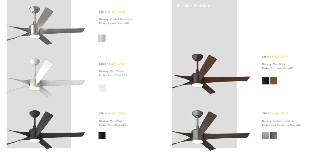 P 101 CINK 58” Ceiling Fan Designed in Studio Kubrick Room Segment : Great Room, Living Room Finishes : ( Shown Right ) Blade Materials : ABS Blade Count : 3 Blades Control (Type) : Remote Wet / Damp : Damp Light Kits : F4IN-120V-R1-30 ( 19.5W )