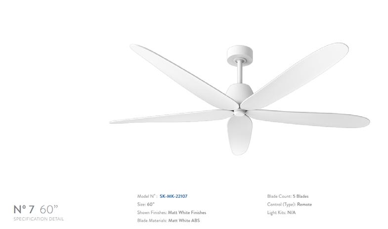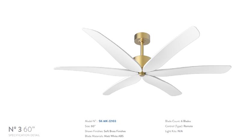 P 110 DAISY 60” Ceiling Fan Designed in Studio Kubrick Room Segment : Great Room, Living Room Finishes : ( Shown Right ) Blade Materials : ABS Blade Count : 5/6 Blades Control (Type) : Remote Wet / Damp : Damp Light Kits : N/A