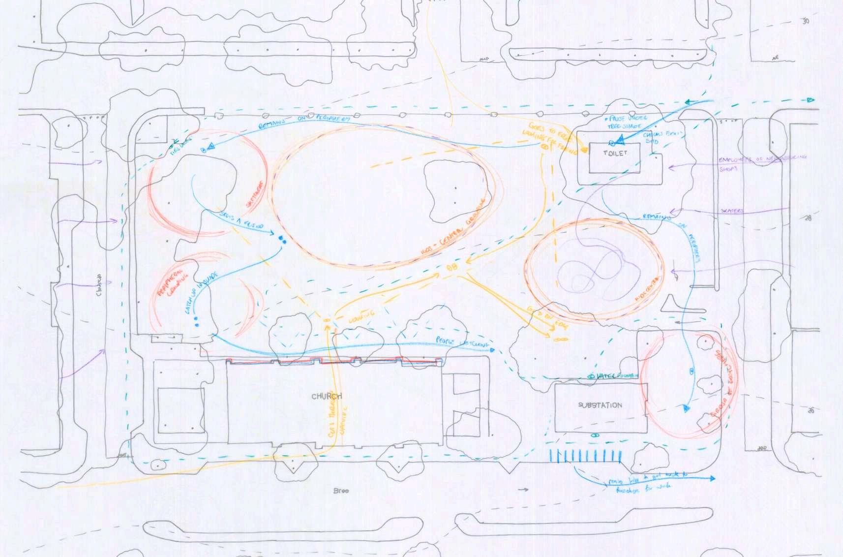 Skateboarding, though perhaps considered a niche activity, was chosen as the main program for the site in celebrating movement and dynamism in the city. This program would allow for interactions between various users and would contributetothislayeredurbanenvironment.