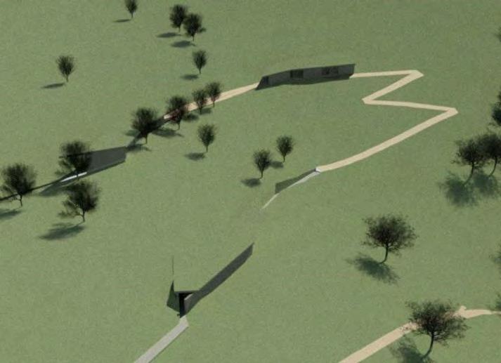 Themuseumwouldtaketheformofa series of exhibition spaces spreadacross,andformedfrom the land and topography. One would progress through the spaces and circle around back to the other side of the memorial with planted berms covering the original steps Invoking a sense of the reclamation of nature.