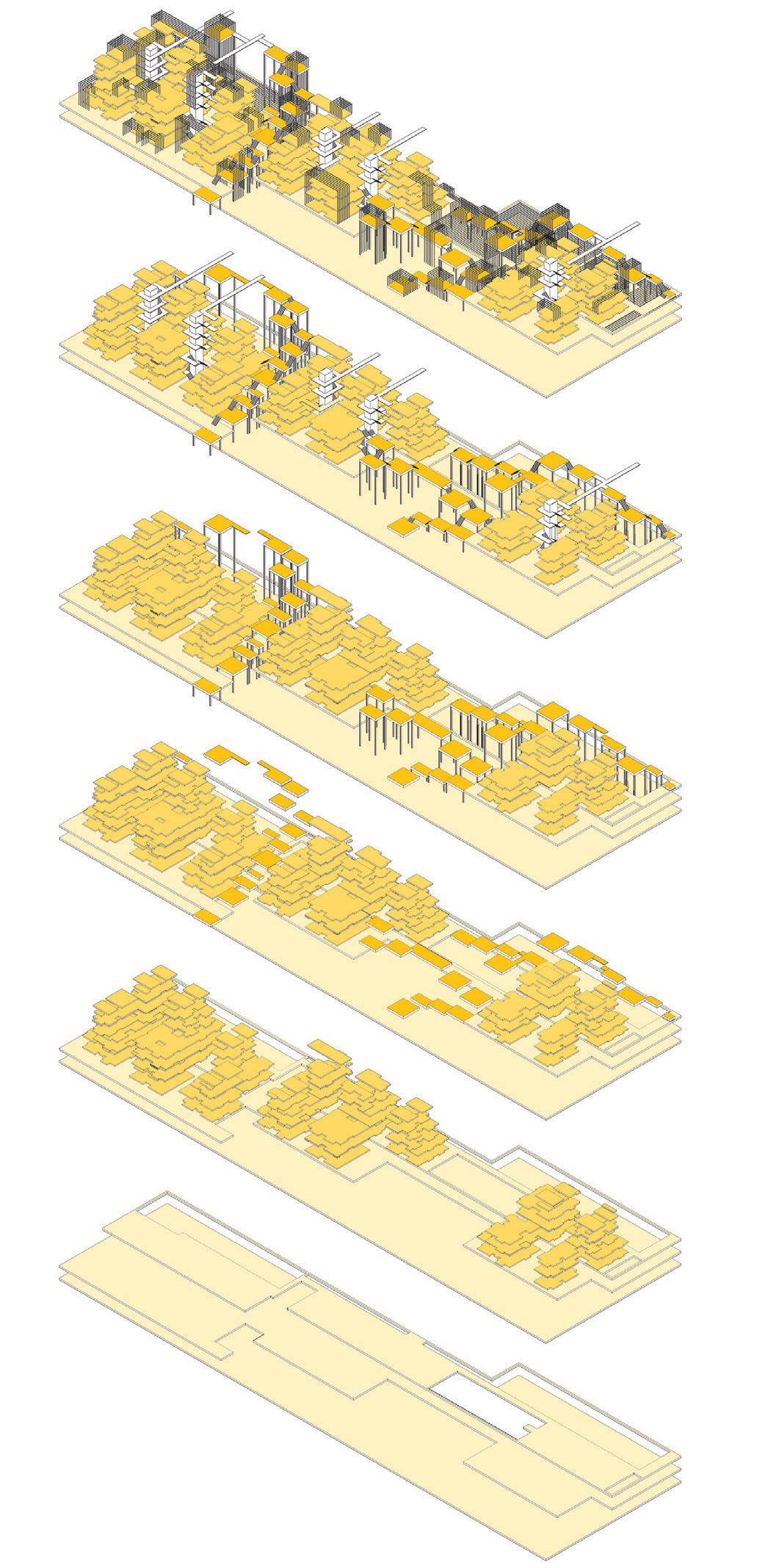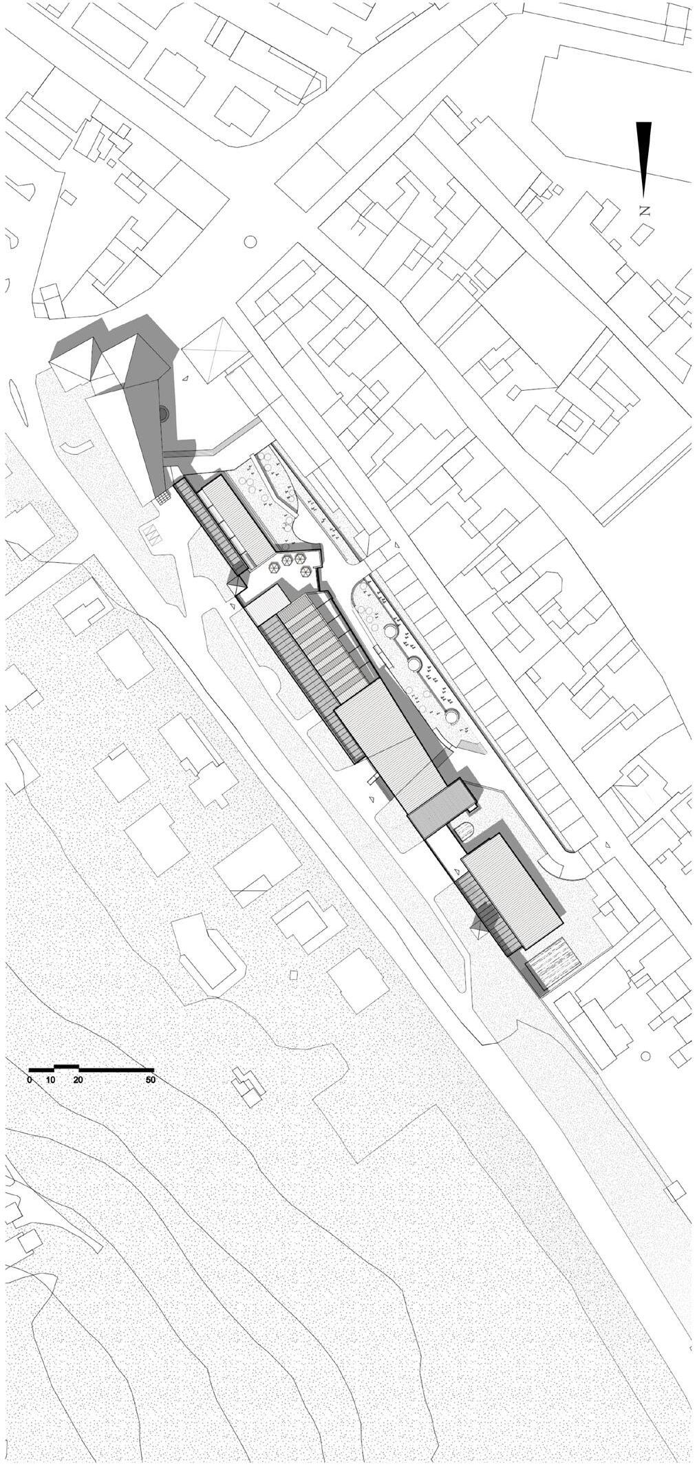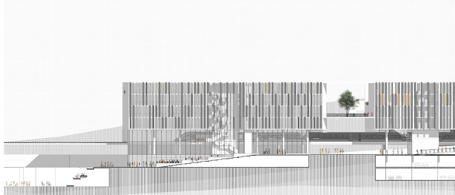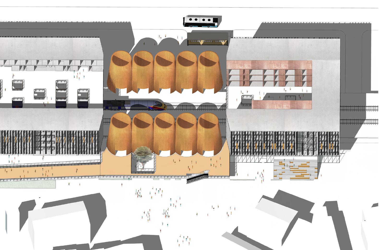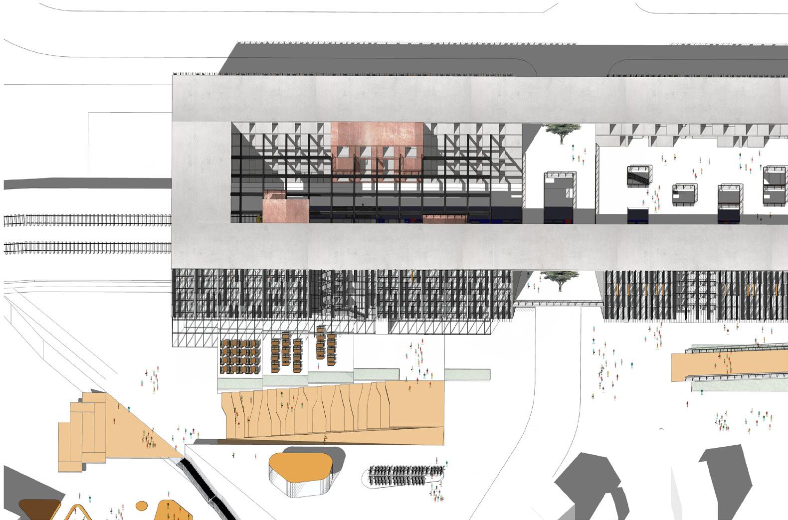 is project, imagined as a megastructure, emerges from a concept of high density, inhabited wall playing a role of watchman of the old town. It includes ve programs - hotel, intergenerational housing, student accommodation, train station and a public plaza.