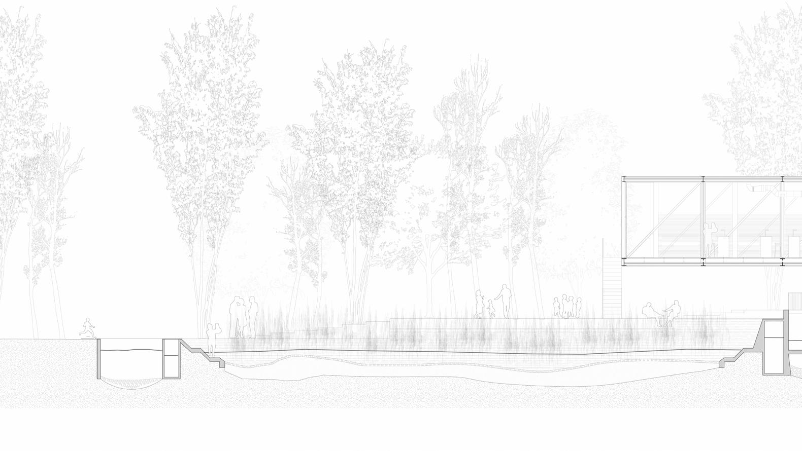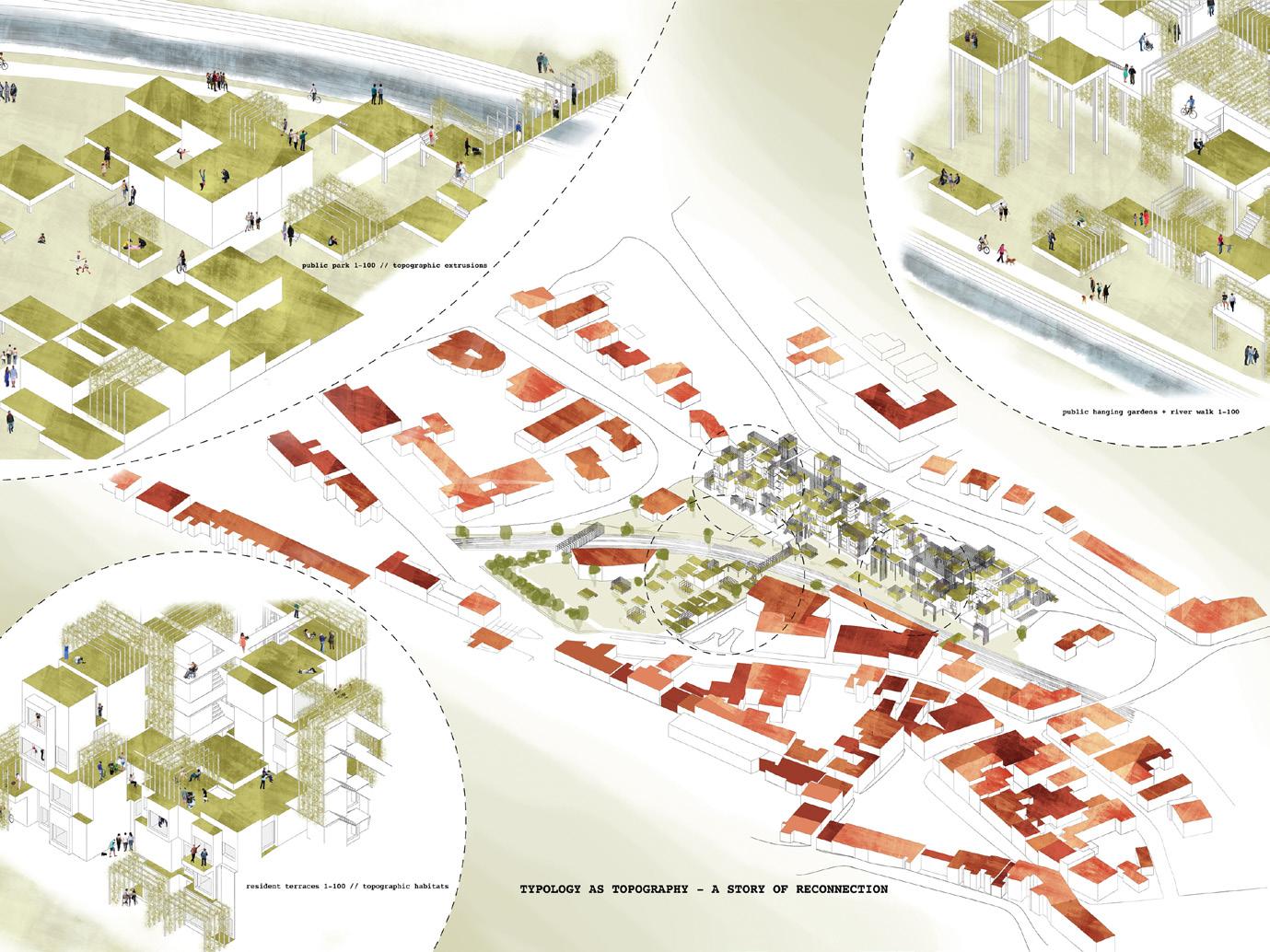Oikologia programmatically proposes a public, educational environment focused on the river, the water and its ecology. Research and knowledge exchange buildings will situate themselves in relation to a natural habitat, leisure environment and public spa, with all buildings engaging with the water ltration process at critical points and in relation to their function.