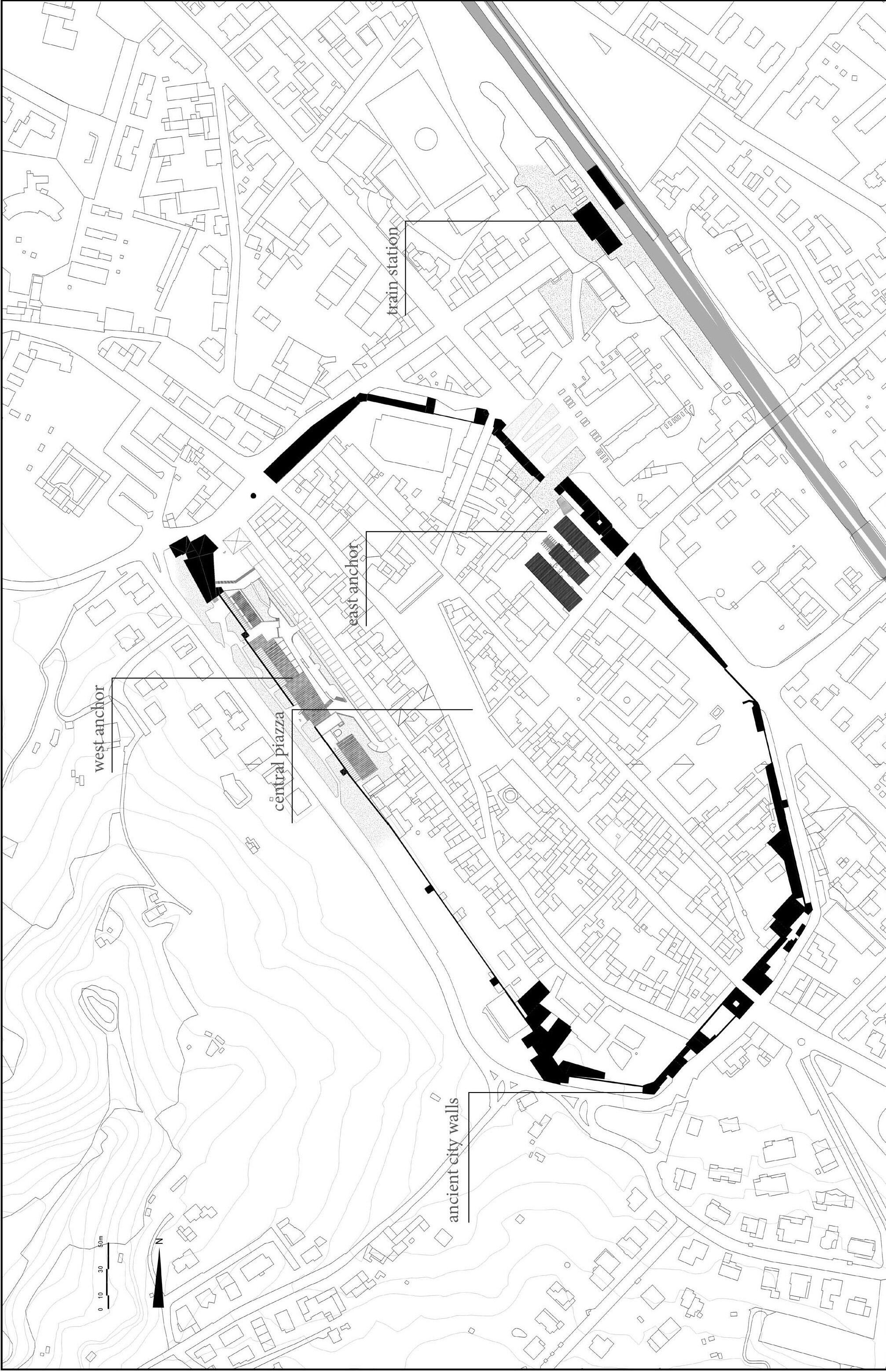 e western edge of the town wall of Figline Valdarno was historically an important physical device for a series of human - defensive, economic, cultural and social activities. From defending against attack by soldiers from other Tuscan towns to peasant tax collection, most of the day to day events up until the Second World War happened along the western edge of the old town boundary wall. In addition, the wellpreserved ancient theatre, city gates and moat are also important marks of Figline’s rich history. However, the careless design and positioning of much contemporary housing has accelerated the decomposition of the ancient city wall, which has gradually been forgotten together with the community it encloses. Furthermore the dispersal of public functions, previously housed inside the old town boundary, allied to a lack of suitable public transport and green public space has created a community which is not t for the purposes of the almost exclusively older community it serves. e Wall-ed Community aims to expand the previously single-layered walls to multi-layered walls and to incorporate nearby housing blocks to form a ‘walled community system’, which will become the new de ned boundary of Figline’s old town. e new ‘wall space’ will be endowed again with public functions and importance and will act as a connection point between inside and outside of the old town, between history and contemporary reality, between public and private and the old and young. .